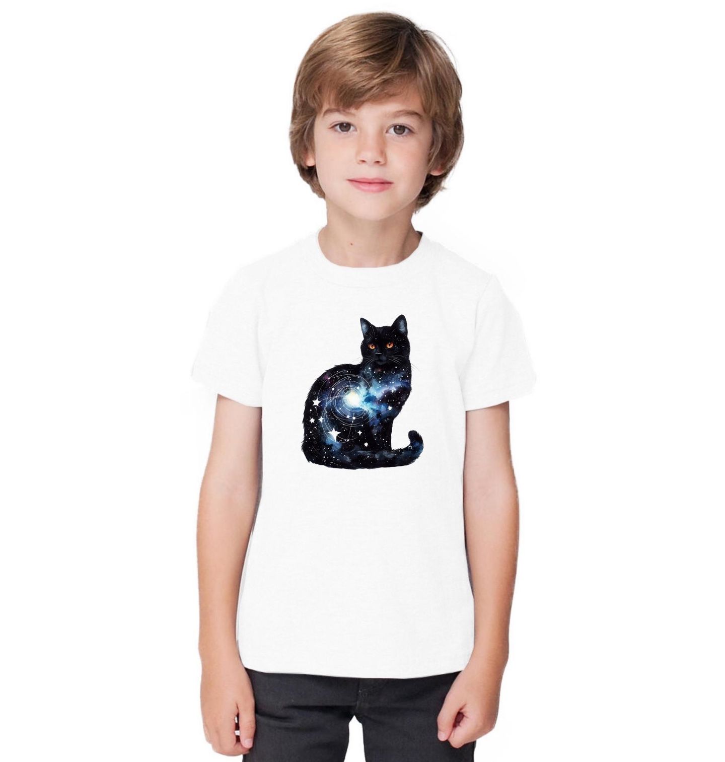 Dětské tričko Černá Kočka a Nekonečný Vesmír. Tento originální motiv zobrazuje mystickou kočka, jejíž silueta je vyplněna nekonečným vesmírem plným světla a hloubky. Z jejího těla září hvězdy a galaktické linie, které vytvářejí dojem propojení zvířete s nekonečnem. Výrazné oči kočky dodávají ilustraci tajemnou a magickou atmosféru.