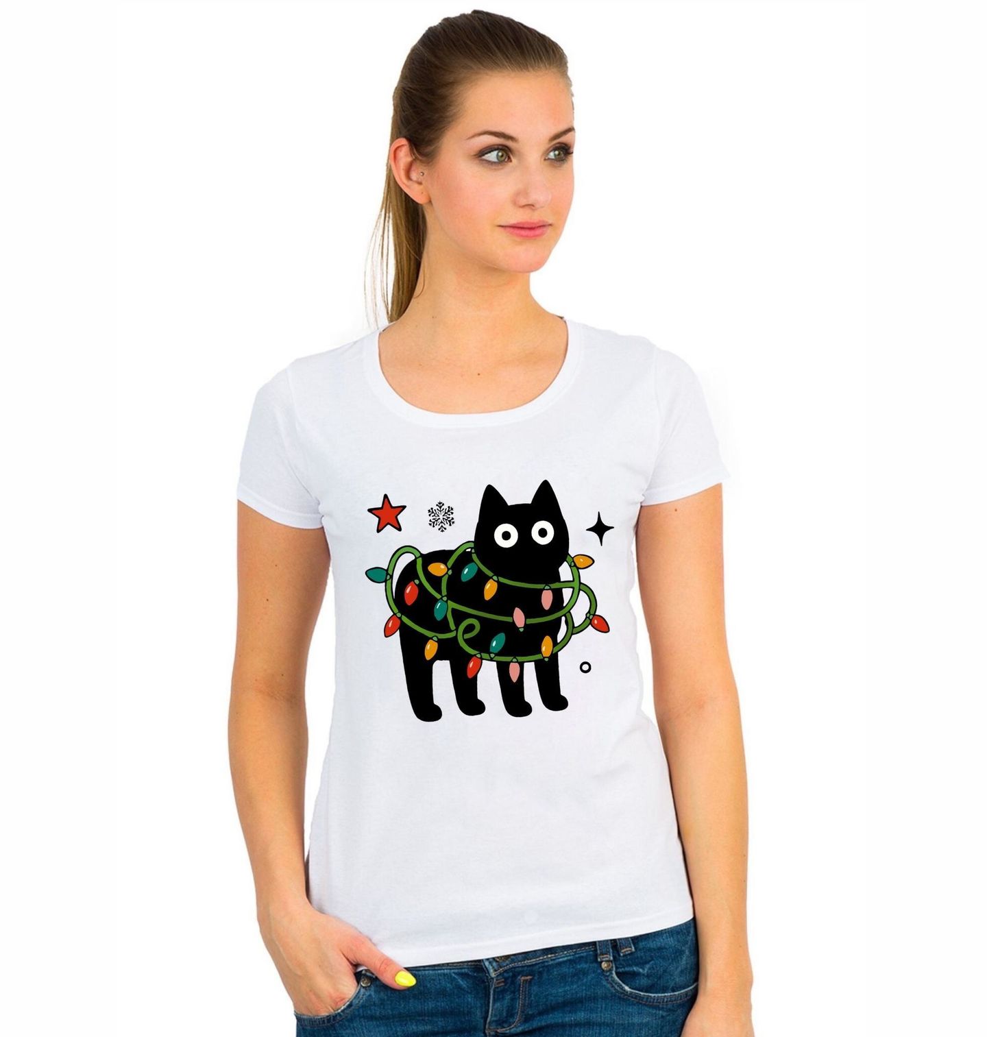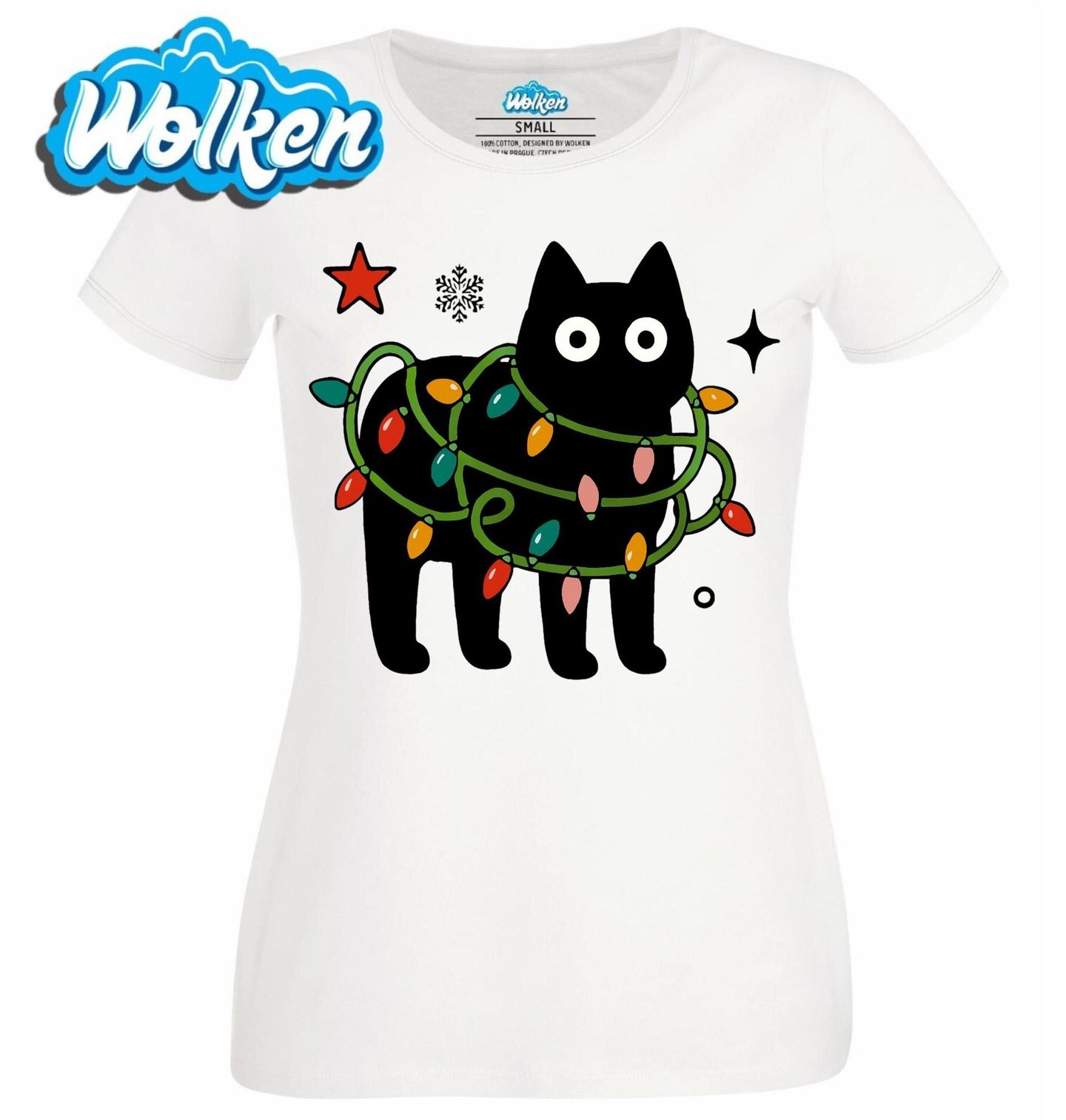 Dámské tričko Černá kočka na Vánoce. Roztomilá černá kočka, která to s vánoční výzdobou trošku přehnala. Vánoce jsou časem světel, ale tahle kočka to vzala doslova – zamotaná do barevných světýlek září jako vánoční ozdoba. Ideální motiv pro všechny milovníky koček a (ne)organizovaných svátků!