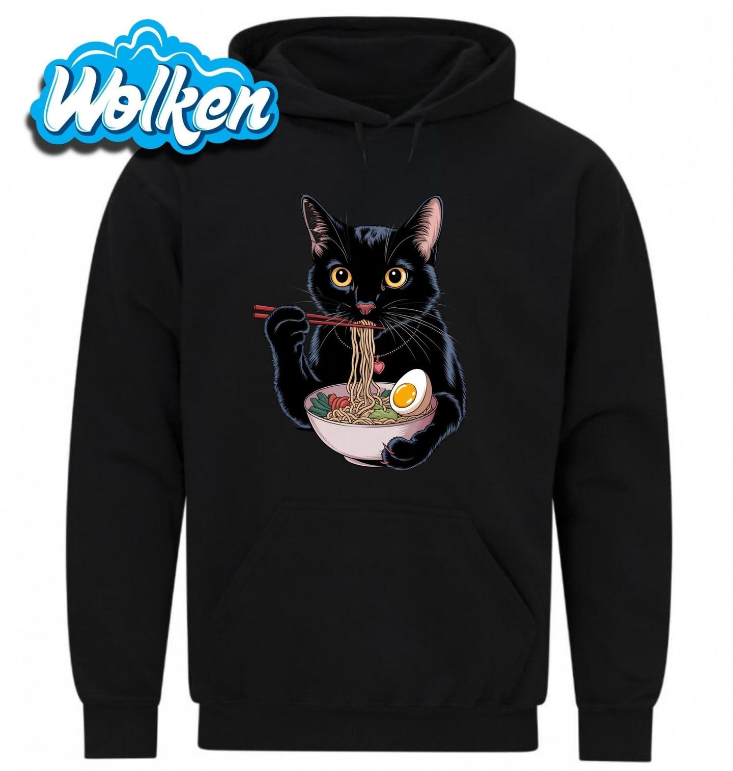 Pánská mikina Černá Kočka Ramen. Černá kočka s hypnotizujícím pohledem si vychutnává svou oblíbenou misku ramenu – s pořádnou dávkou nudlí, zeleniny a perfektně uvařeným vajíčkem. Tento design spojuje mystiku černých koček s láskou k jídlu, takže je ideální pro milovníky koček a fanoušky japonské kuchyně.