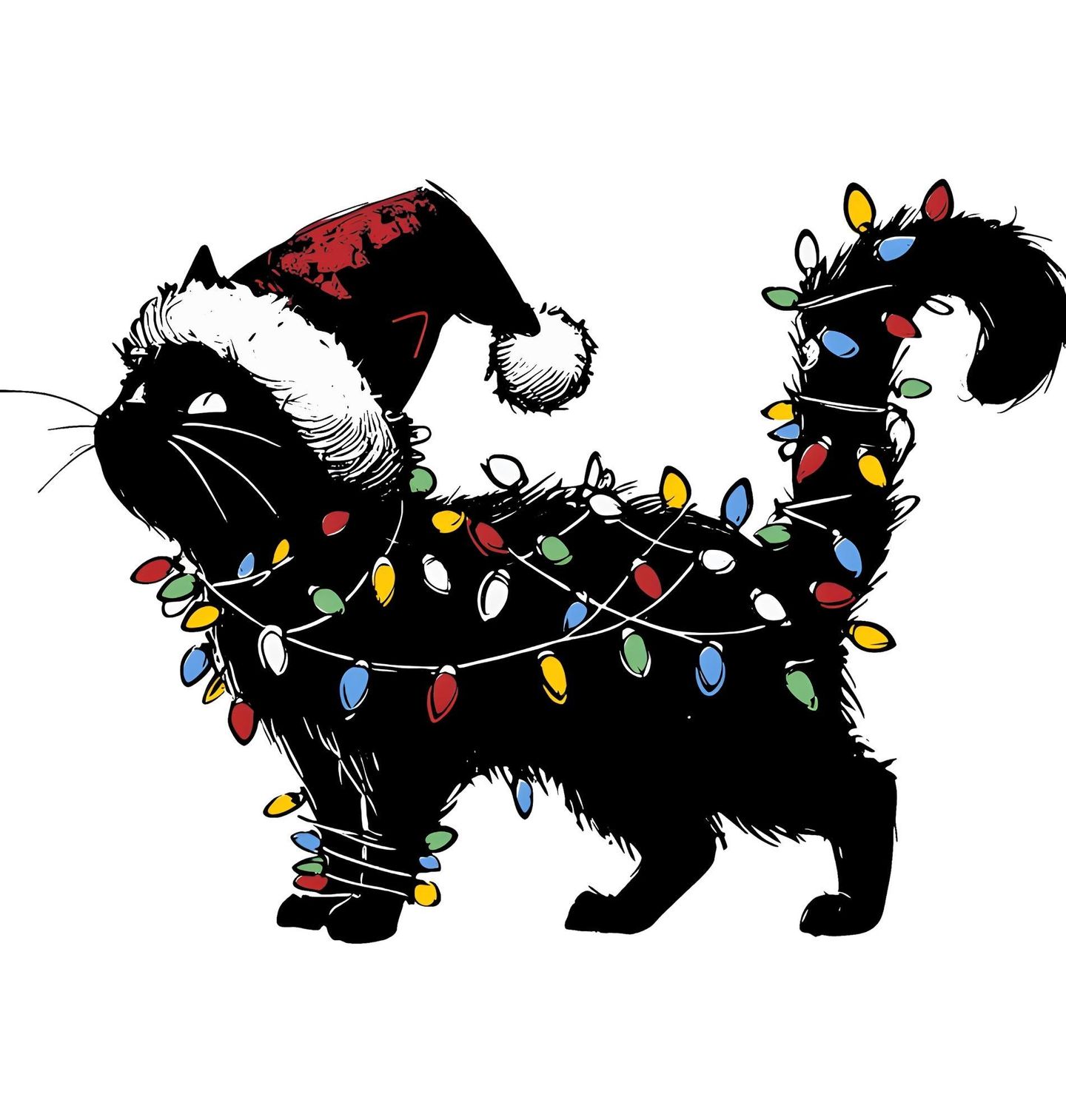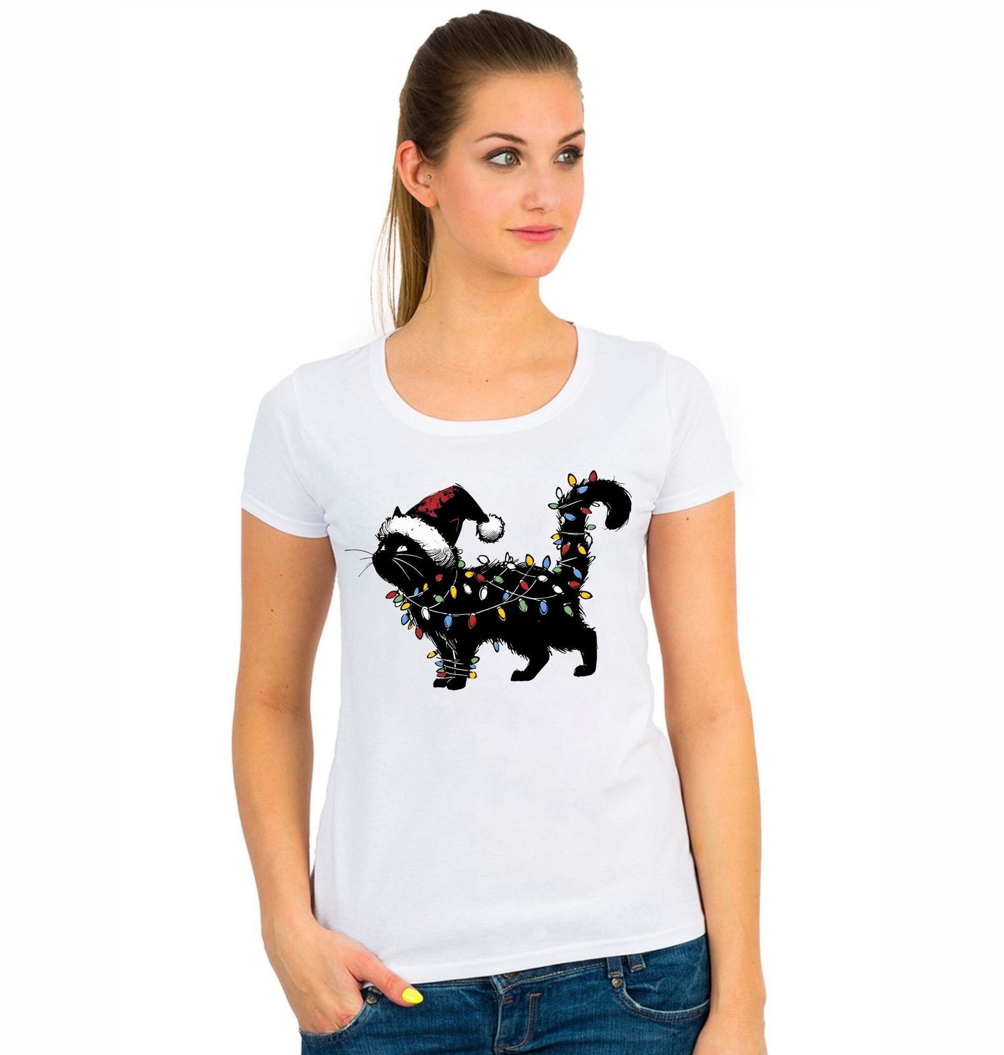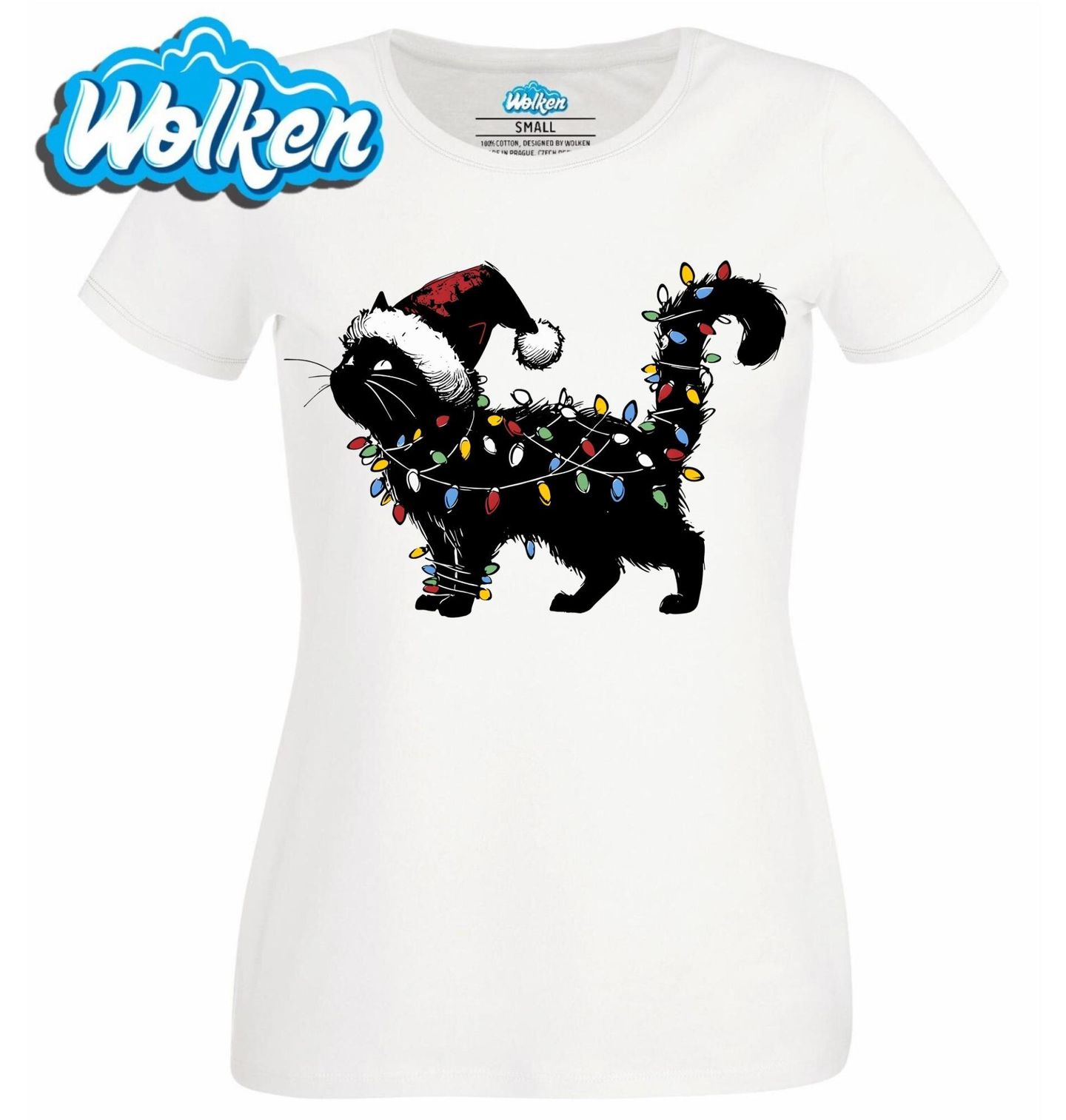 Dámské tričko Černá Kočka se Světýlky. Tato stylová ilustrace rozzáří sváteční náladu! Kočka ve vánočních světýlkách vypadá, jako by se sama proměnila ve vánoční stromeček. Ideální motiv pro každého milovníka koček, kterému nejsou cizí vánoční lapálie. Kočka, Vánoce a svítící pohoda v jednom!