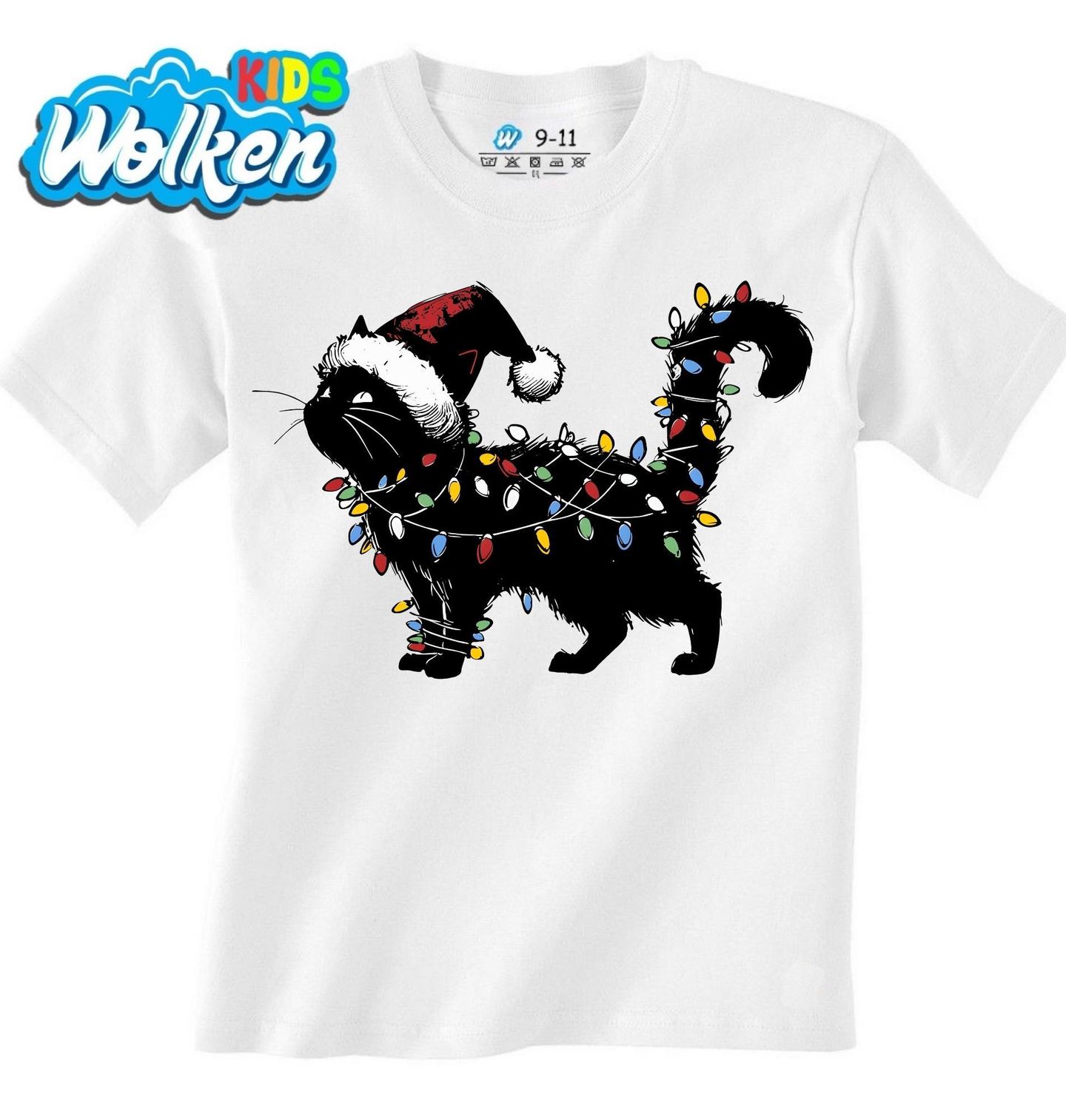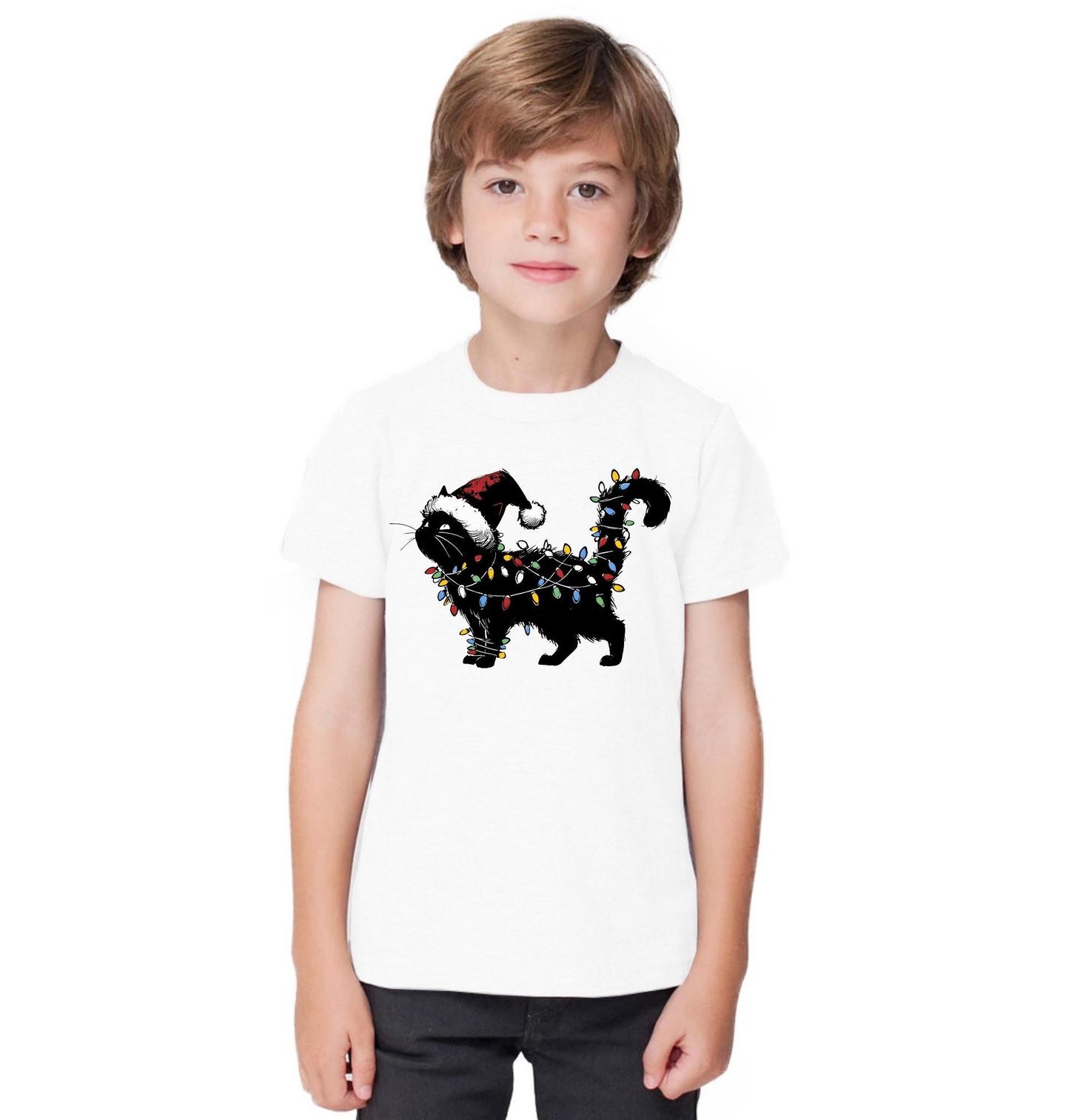 Dětské tričko Černá Kočka se Světýlky. Tato stylová ilustrace rozzáří sváteční náladu! Kočka ve vánočních světýlkách vypadá, jako by se sama proměnila ve vánoční stromeček. Ideální motiv pro každého milovníka koček, kterému nejsou cizí vánoční lapálie. Kočka, Vánoce a svítící pohoda v jednom!