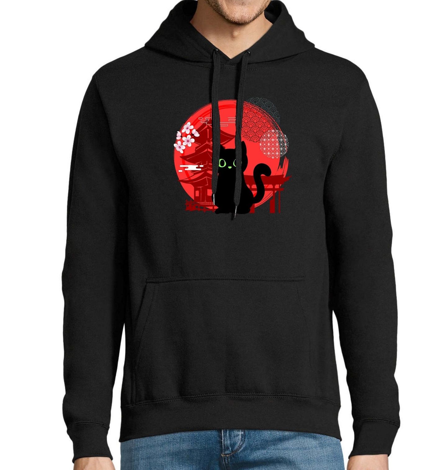Pánská mikina Černá Kočka u Japonské Pagody. Černá kočka se zářivýma zelenýma očima, v červeném pozadí je pagoda, torii brána a sakura – symboly tradiční japonské kultury. Tento originální design ocení milovníci koček i Japonska, kteří chtějí nosit stylový a jedinečný kousek inspirovaný Východem. Ideální jako dárek pro ty, kdo mají rádi kočky, Japonsko a pagody v uměleckém zpracování.