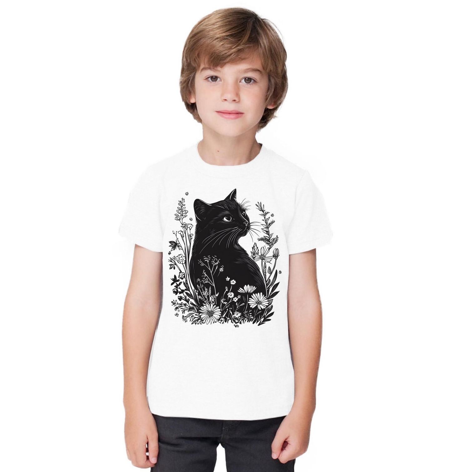 Dětské tričko Černá Kočka v Květinové Zahradě. Kočka obklopená detailně kreslenými květinami působí klidně, hrdě a zároveň velmi stylově. Precizní linie a přírodní prvky dodávají designu harmonii, která zaujme na první pohled. Kočka je zde symbolem elegance, nezávislosti a přirozené krásy. Květinové detaily kolem ní vytvářejí romantickou atmosféru a dodávají motivu lehkost i umělecký nádech.