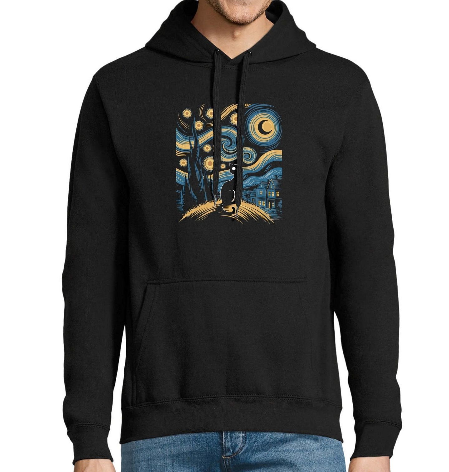 Pánská mikina Černá Kočka ve Hvězdné noci. Originální tričko s motivem tajemné kočky sedící pod vířící noční oblohou inspirovanou ikonickým obrazem „Hvězdná noc“ od Vincenta van Gogha. Tento stylový design propojuje svět výtvarného umění a lásky ke kočkám – výsledkem je elegantní, poetické a zároveň výjimečné tričko.