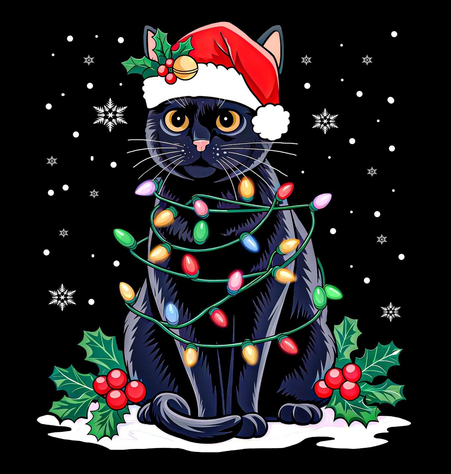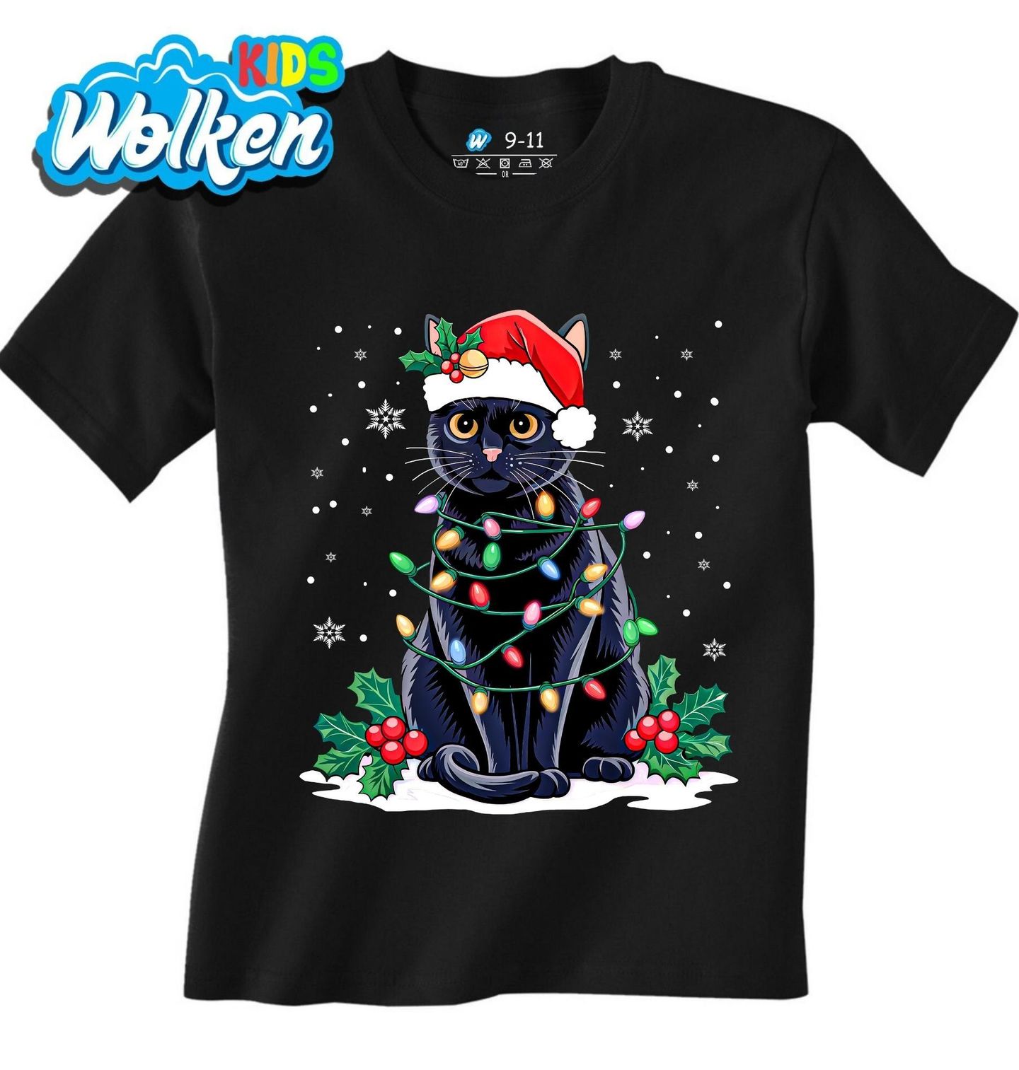 Dětské tričko Černá Kočka ve Sněhu. Tato roztomilá černá kočka je připravena na Vánoce – v červené čepici a omotaná barevnými světýlky se stala hlavní ozdobou každého svátečního dne. Motiv plný pohody, humoru a kočičího šarmu je perfektní volbou pro milovníky Vánoc a koček.