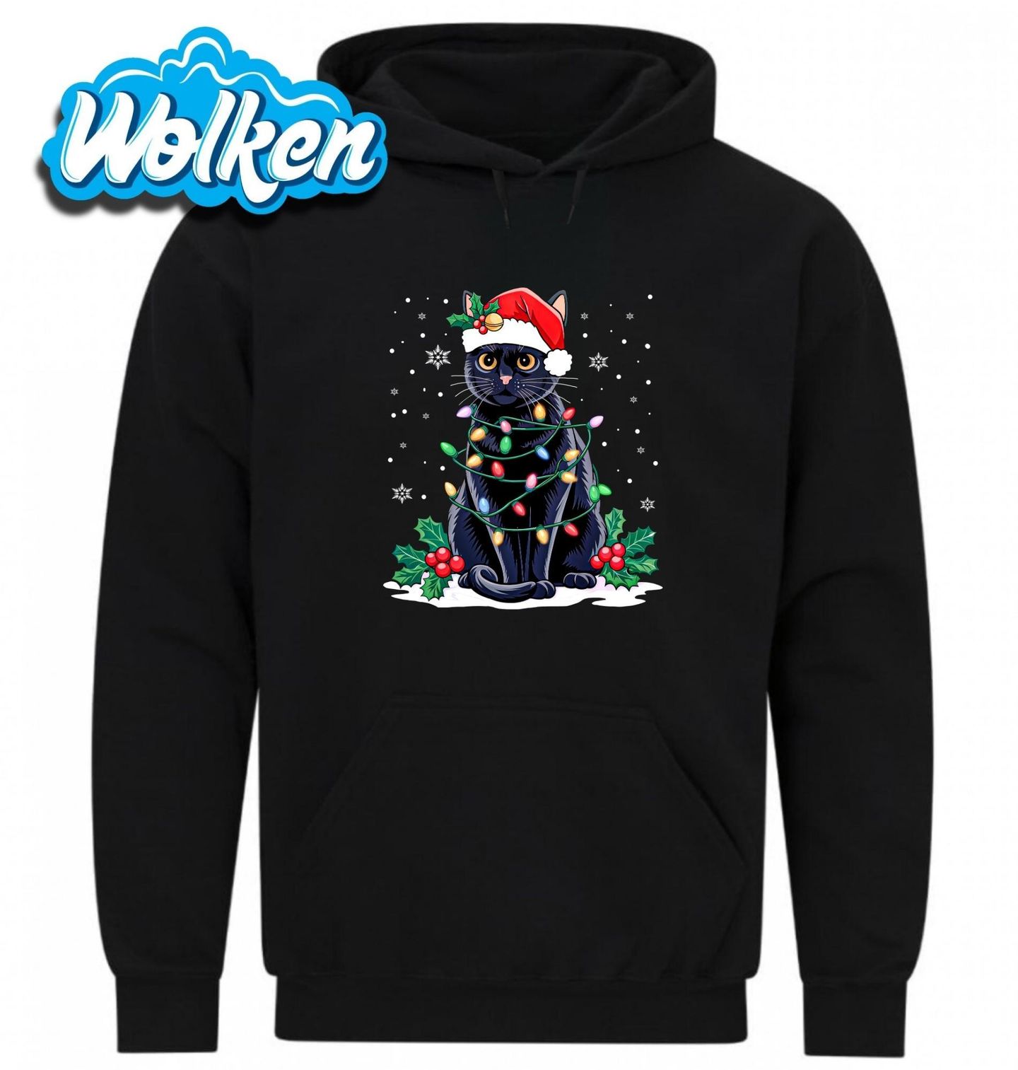 Pánská mikina Černá Kočka ve Sněhu. Tato roztomilá černá kočka je připravena na Vánoce – v červené čepici a omotaná barevnými světýlky se stala hlavní ozdobou každého svátečního dne. Motiv plný pohody, humoru a kočičího šarmu je perfektní volbou pro milovníky Vánoc a koček.