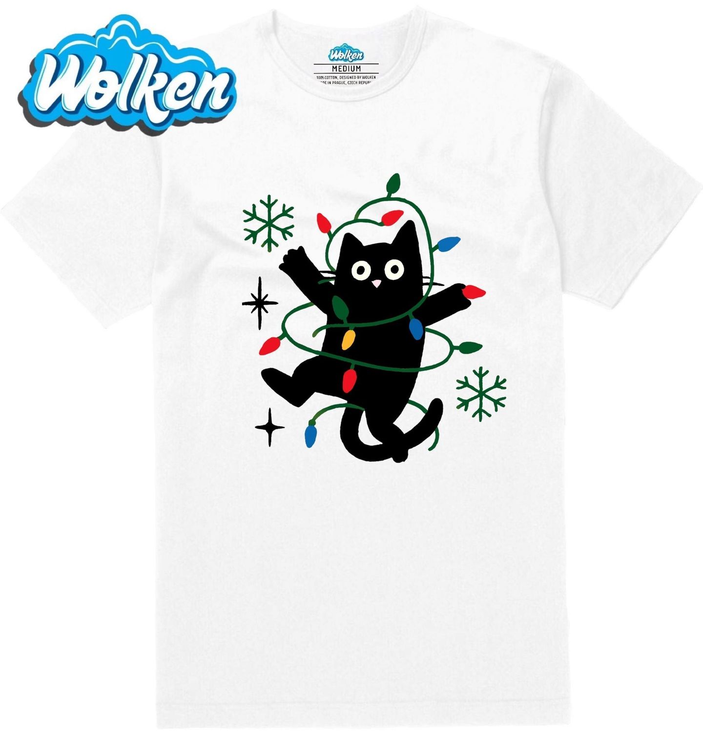 Pánské tričko Černá Kočka ve Světýlkách. Veselý motiv, který spojí lásku ke zvířatům a vánoční atmosféru! Roztomilá kočka zamotaná do barevných světýlek ztělesňuje ty pravé Vánoce – trochu chaosu, hodně smíchu a spousta lásky. Skvělý dárek pro milovníky koček, vánoční fanatiky nebo obojí zároveň.