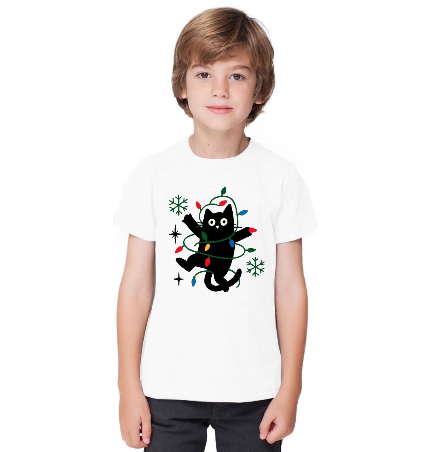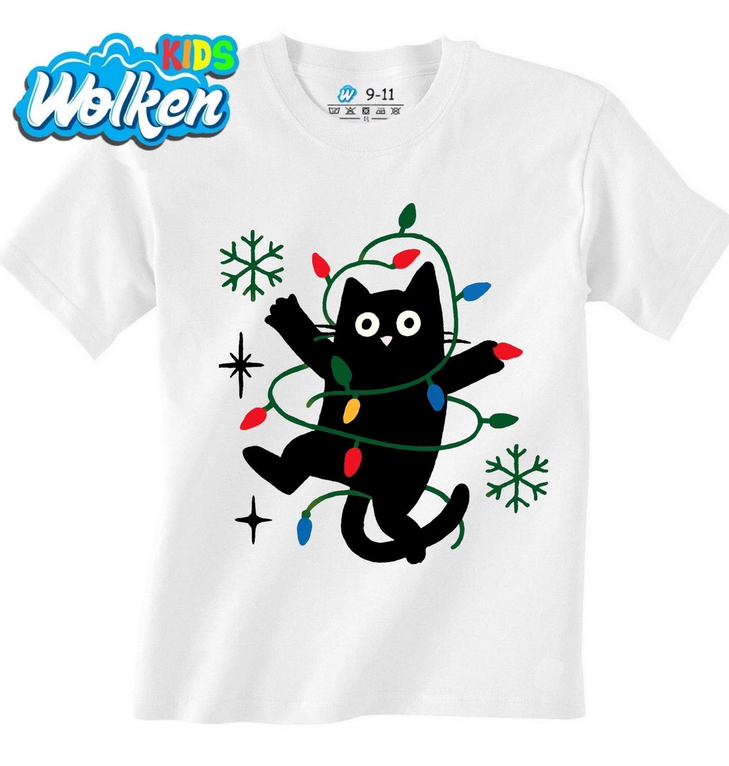 Dětské tričko Černá Kočka ve Světýlkách. Veselý motiv, který spojí lásku ke zvířatům a vánoční atmosféru! Roztomilá kočka zamotaná do barevných světýlek ztělesňuje ty pravé Vánoce – trochu chaosu, hodně smíchu a spousta lásky. Skvělý dárek pro milovníky koček, vánoční fanatiky nebo obojí zároveň.
