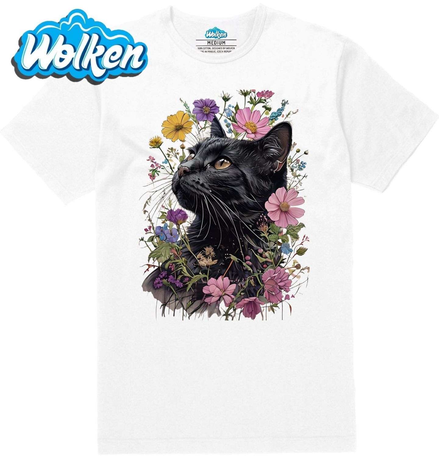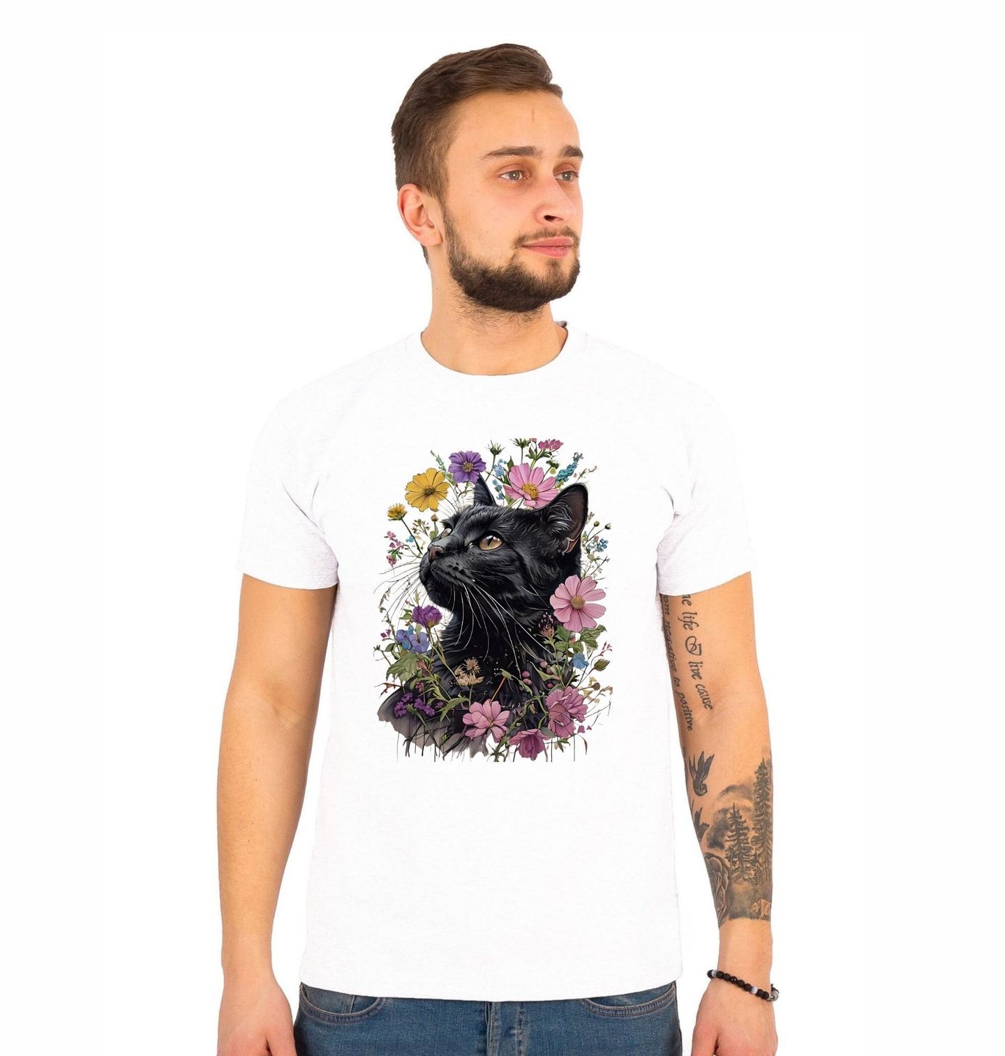 Pánské tričko Černá Květinová Kočka. Roztomilá kočka s hebrou srstí se nachází uprostřed krásného květinového zátiší. Tento motiv kombinuje jemnost květin s půvabem kočky, čímž vzniká unikátní dekorace, která potěší milovníky koček i přírody.