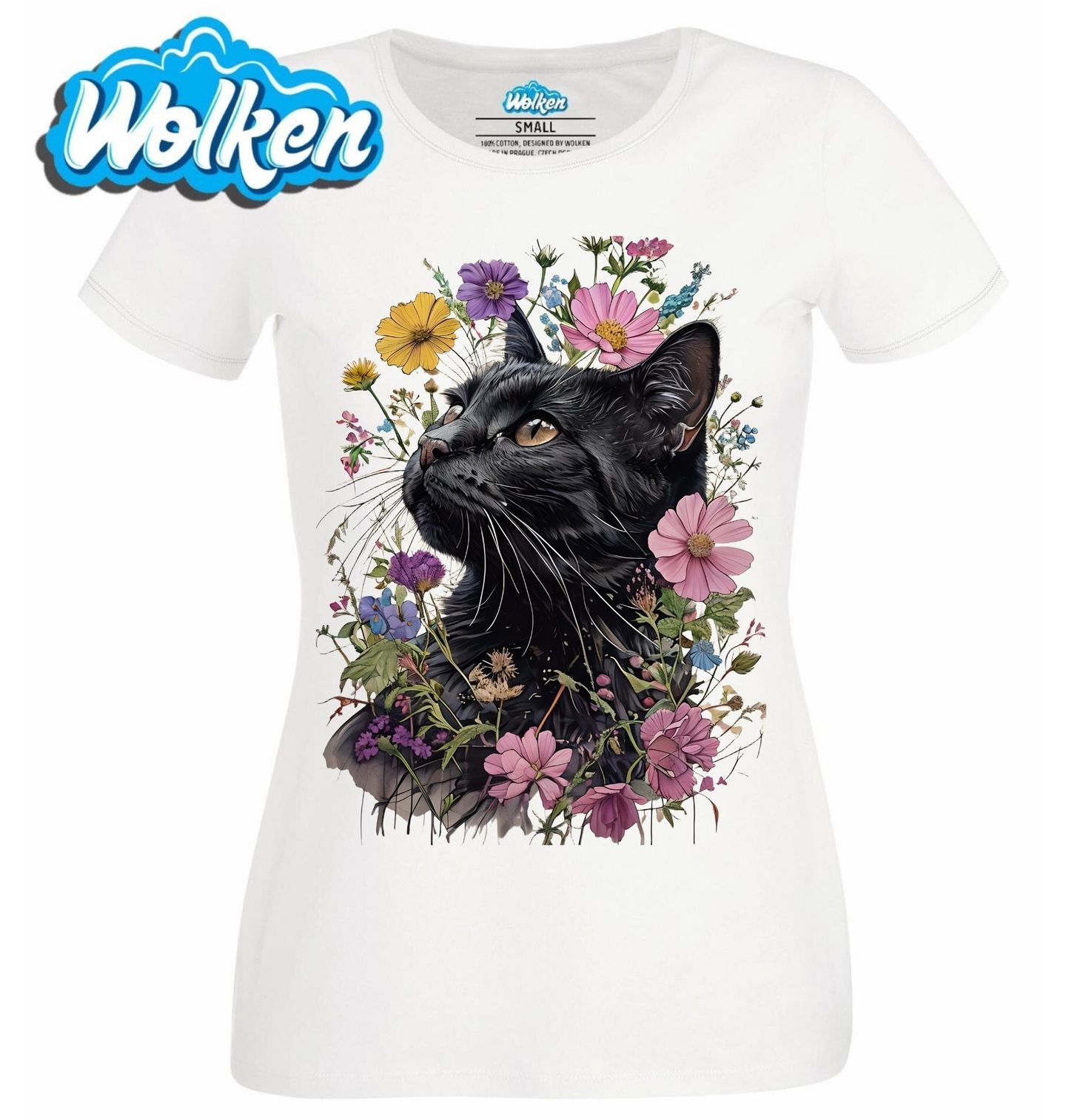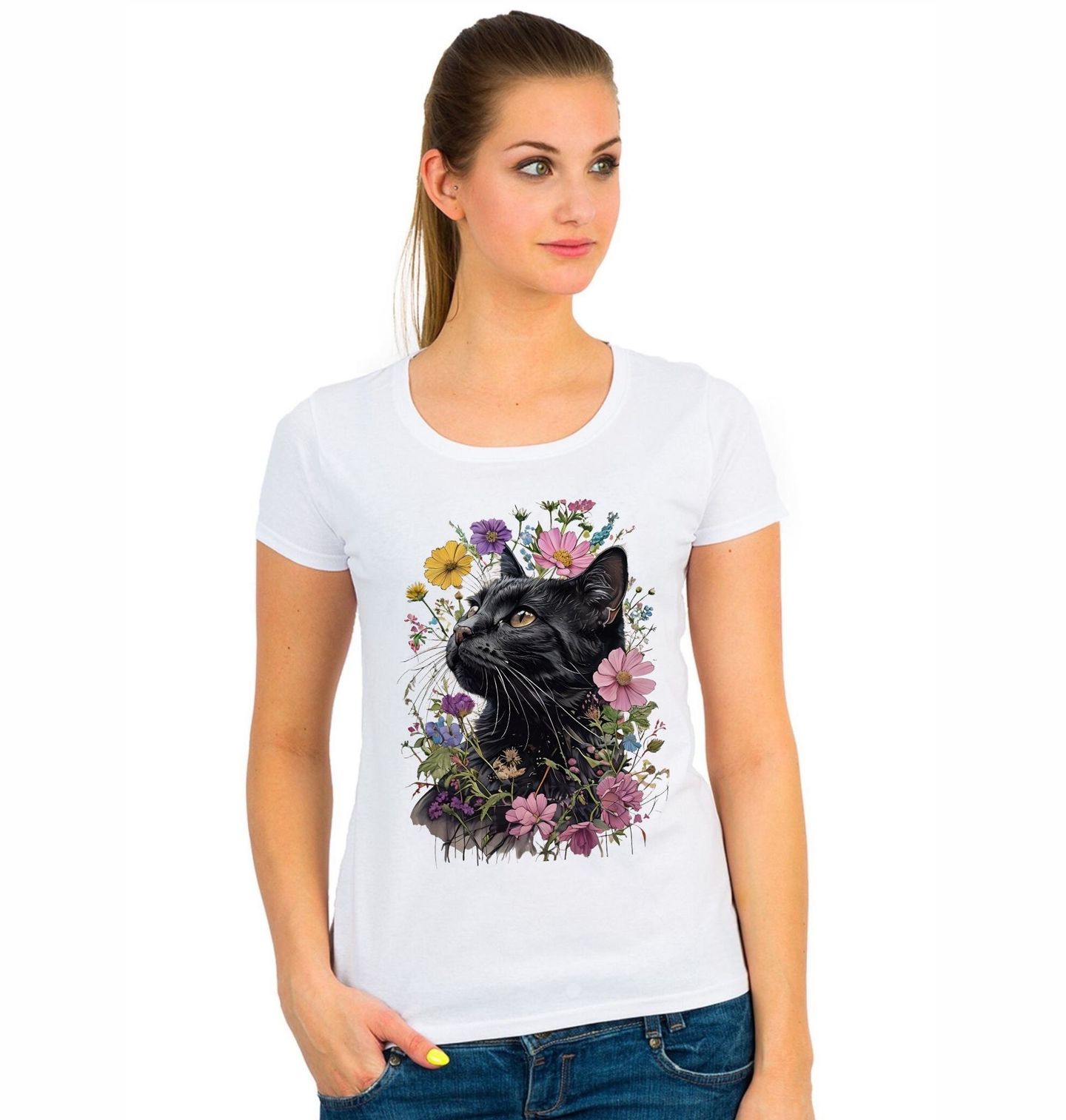Dámské tričko Černá Květinová Kočka. Roztomilá kočka s hebrou srstí se nachází uprostřed krásného květinového zátiší. Tento motiv kombinuje jemnost květin s půvabem kočky, čímž vzniká unikátní dekorace, která potěší milovníky koček i přírody.
