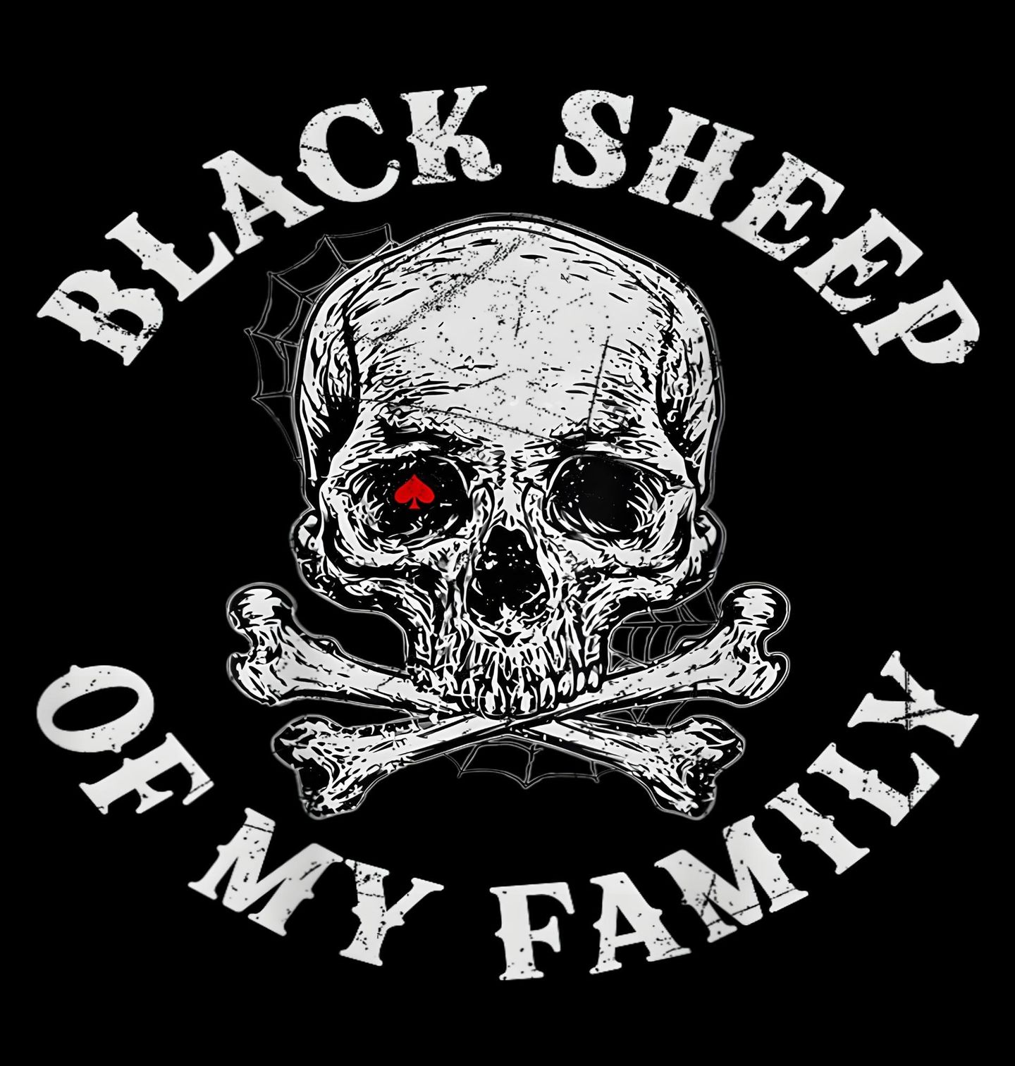 Dámské tričko Černá ovce mojí rodiny. Na motivu je nápis „Black Sheep of My Family“ (Černá ovce mojí rodiny). Uprostřed je detailní ilustrace lebka se zkříženými kostmi, v oku má malý červený symbol pikového listu. Symbolizuje nespoutanost a odlišnost – ideální pro všechny, kdo se cítí být černou ovcí rodiny a jsou na to hrdí.