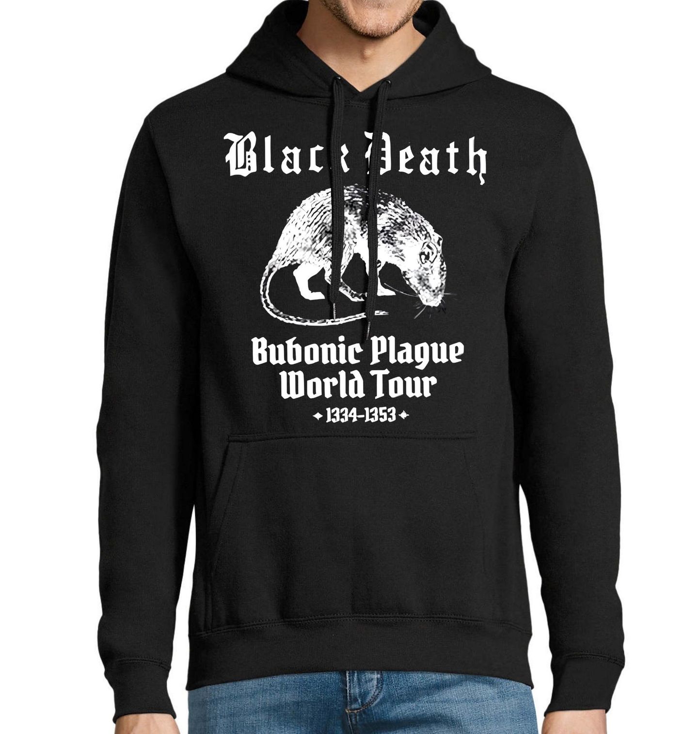 Pánská mikina Černá Smrt Světové Turné Bubonic Plague. Černý humor v té nejčistší podobě, který si bere na mušku největší „event“ středověku. Triko je stylizované jako merch ke koncertnímu turné, ovšem místo kapely jsou zde vypsány země zasažené dýmějovým morem. Detailní grafika krysy a gotické písmo dodávají designu autentický historický a zároveň lehce morbidní nádech. Je to perfektní volba pro milovníky historie s pořádnou dávkou sarkasmu.