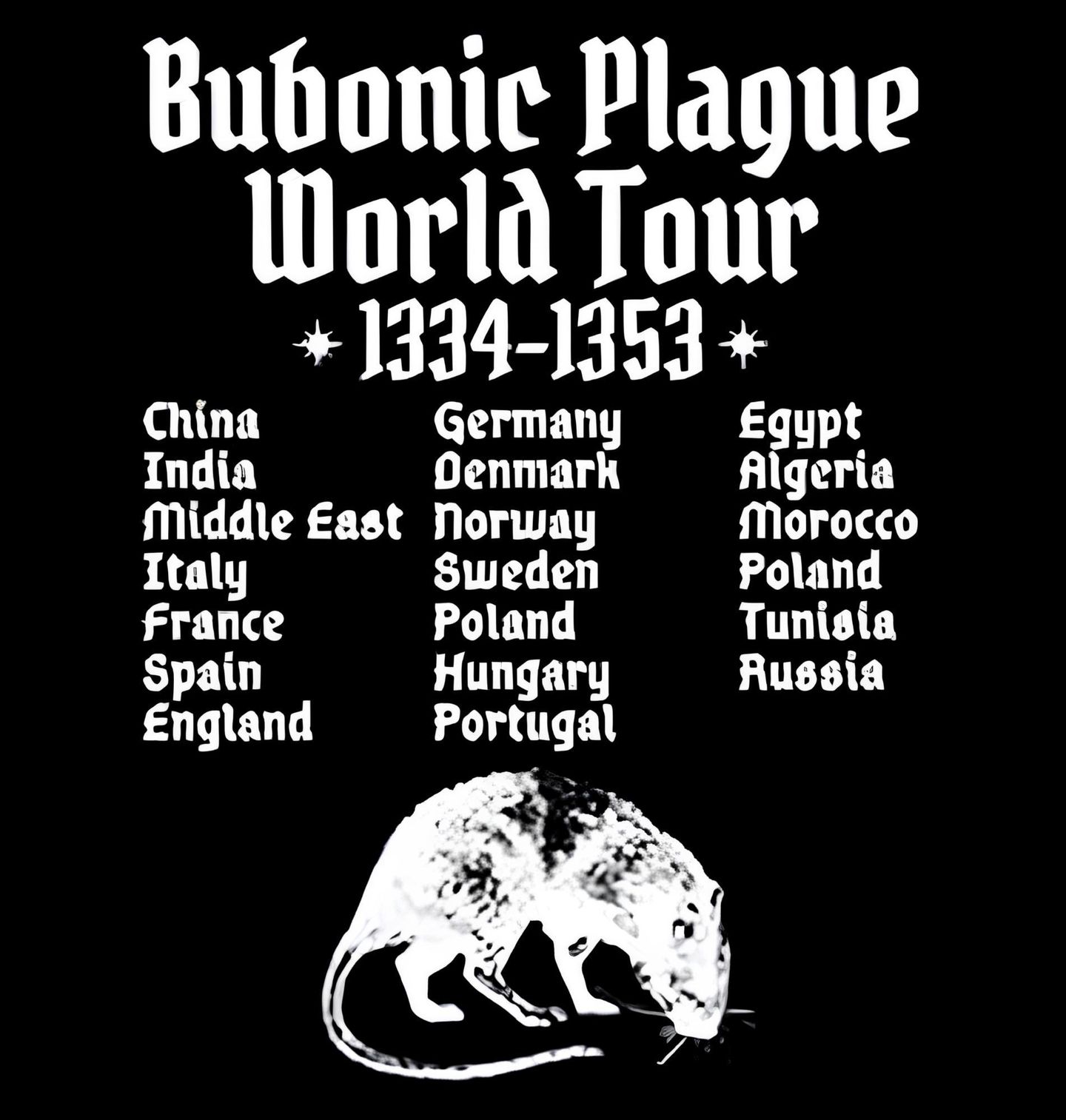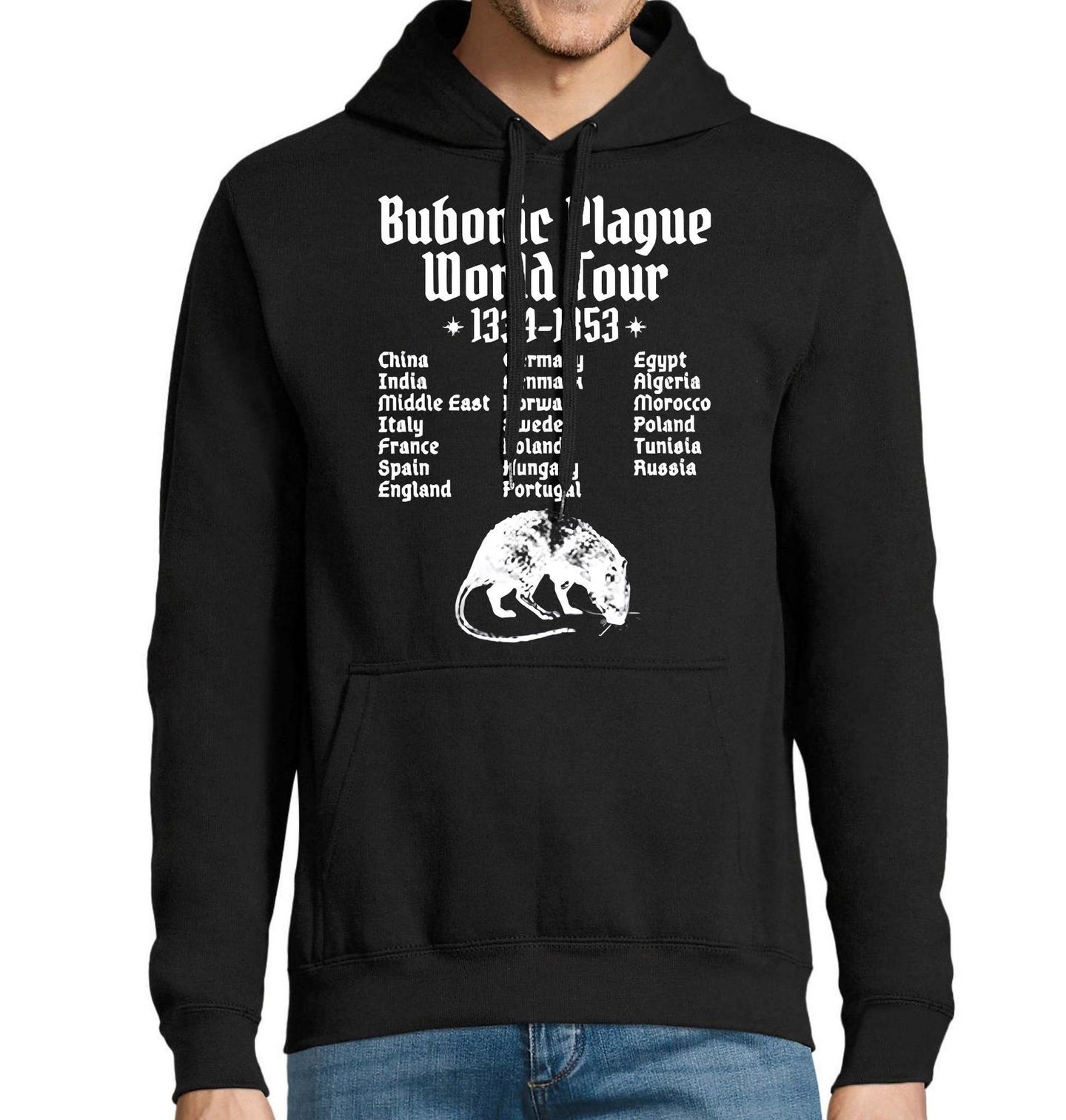Pánská mikina Černá Smrt Světové Turné Bubonického Moru. Černý humor v té nejčistší podobě, který si bere na mušku největší „event“ středověku. Triko je stylizované jako merch ke koncertnímu turné, ovšem místo kapely jsou zde vypsány země zasažené dýmějovým morem. Detailní grafika krysy a gotické písmo dodávají designu autentický historický a zároveň lehce morbidní nádech. Je to perfektní volba pro milovníky historie s pořádnou dávkou sarkasmu.
