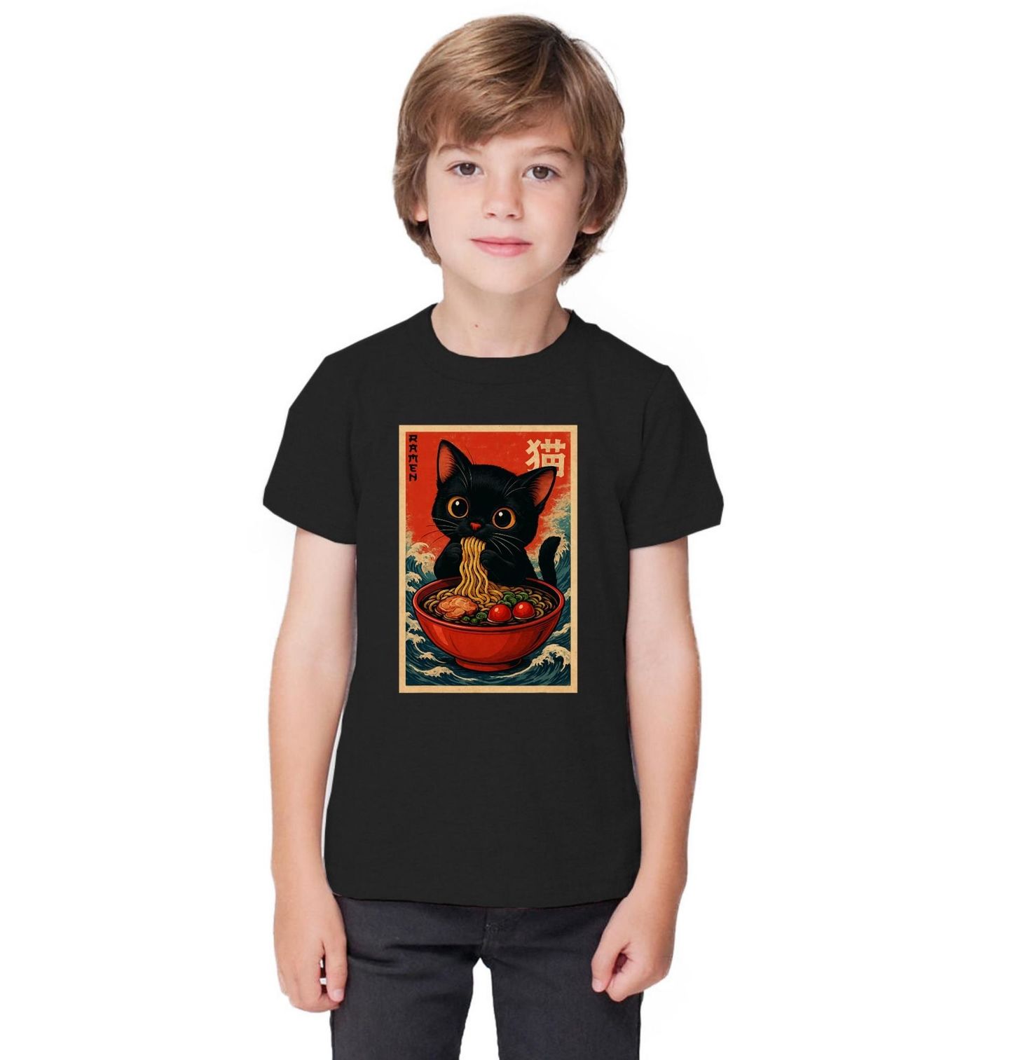 Dětské tričko Černé Kotě s Ramenem. Roztomilá černá kočka sedí přímo v misce a s nadšením srká horký ramen. Ilustrace je laděná do stylu starých plakátů z Japonska, s výrazným červeným pozadím, japonským nápisem „kočka“ a tradiční atmosférou. Tento motiv je ideální pro všechny, kdo milují kočky a Japonsko.