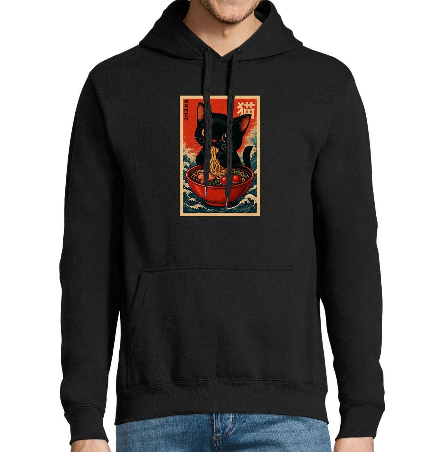 Pánská mikina Černé Kotě s Ramenem. Roztomilá černá kočka sedí přímo v misce a s nadšením srká horký ramen. Ilustrace je laděná do stylu starých plakátů z Japonska, s výrazným červeným pozadím, japonským nápisem „kočka“ a tradiční atmosférou. Tento motiv je ideální pro všechny, kdo milují kočky a Japonsko.