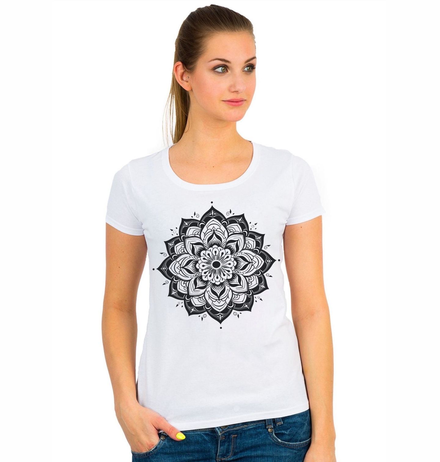 Dámské tričko Černobílá Mandala Klidu. Mandala je tradiční symbol používaný při meditaci a józe jako pomůcka pro soustředění, zklidnění mysli a dosažení vnitřní rovnováhy. Vzor vychází z principů posvátné geometrie, kde každý tvar a linie představují řád, jednotu a harmonii. Mandala podporuje meditativní stav, pomáhá zpomalit myšlenky a navodit pocit klidu a stability.