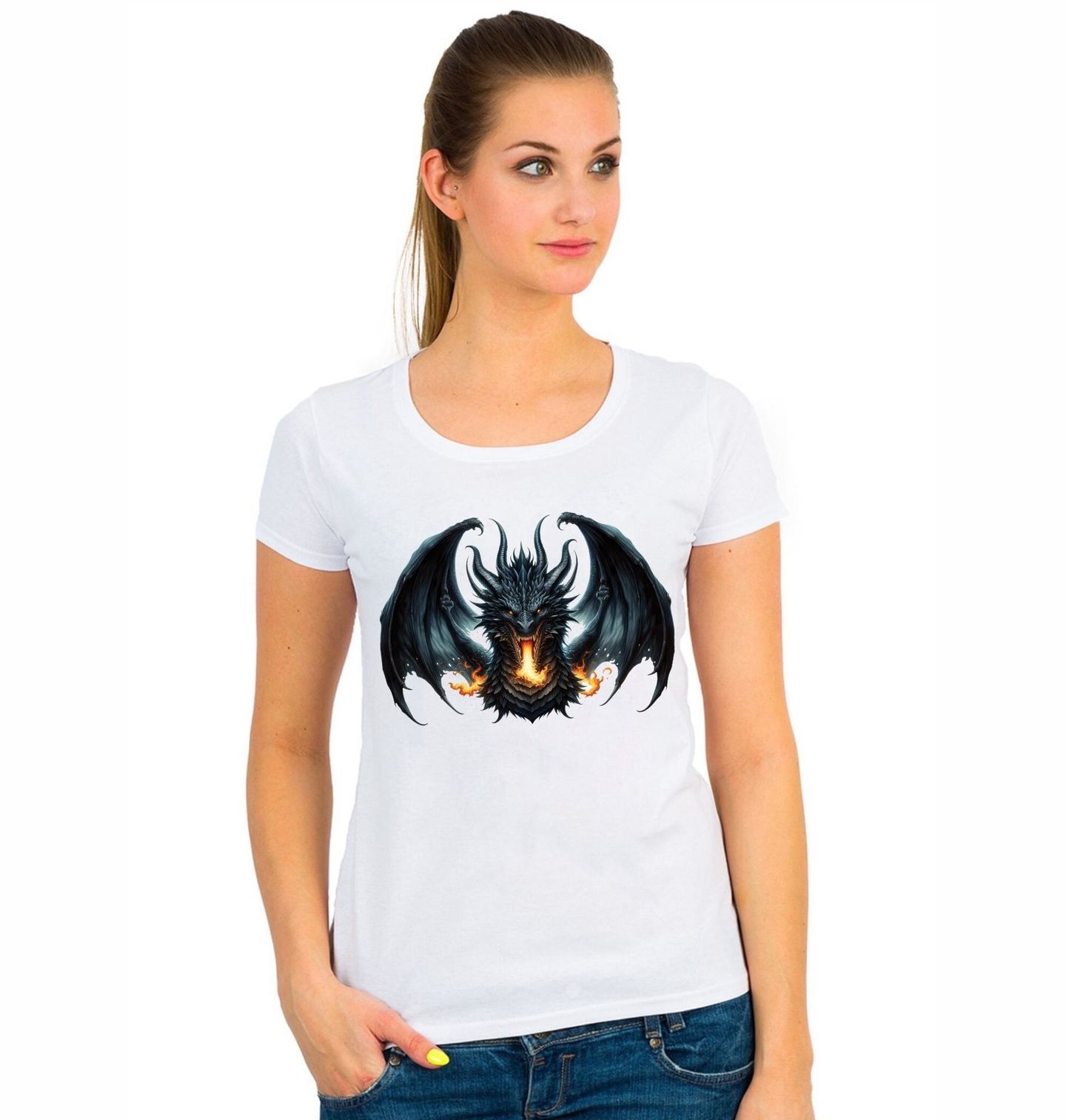Dámské tričko Černý Drak Chrlící Oheň. Motiv drak v tomto provedení představuje surovou sílu, nezkrotnou energii a pradávnou moc. Ohnivý dech, roztažená křídla a temná silueta vytvářejí působivý vizuál, který okamžitě zaujme každého fanouška světa fantasy. Tento design je symbolem dominance, odvahy a legend, které ožívají v mytologických příbězích.