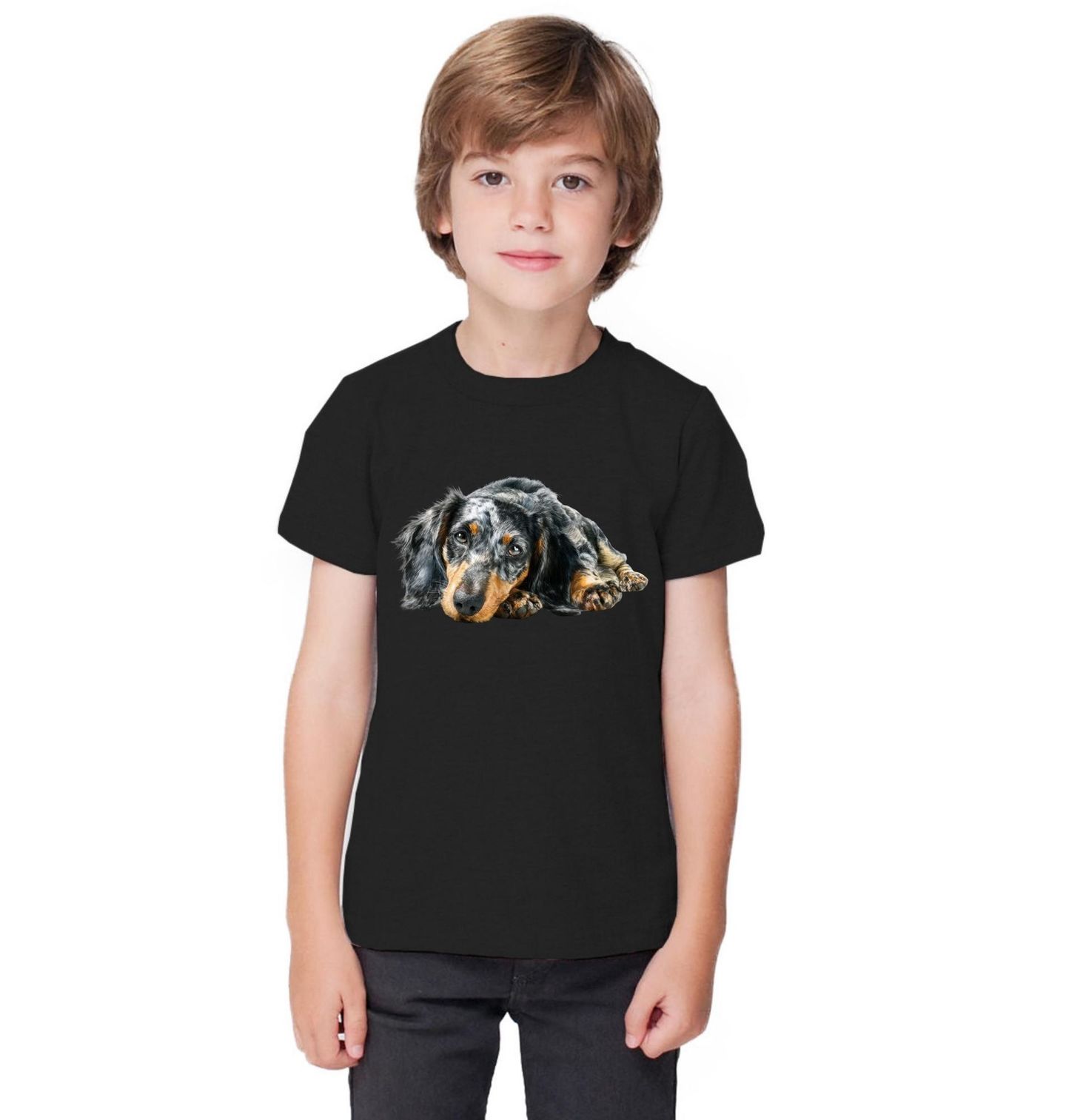 Dětské tričko Černý Jezevčík Krátkosrstý. Jezevčík leží v tichu, hlavu položenou, oči plné důvěry a klidu. Přesně ty chvíle, které každý pejskař zná – žádná akce, žádný hluk, jen přítomnost a pocit, že nejsi sám. Motiv působí jemně, hřejivě a opravdově. Ideální pro milovníky psů, klidných momentů a obrázků, které mají duši a umí zpomalit den.