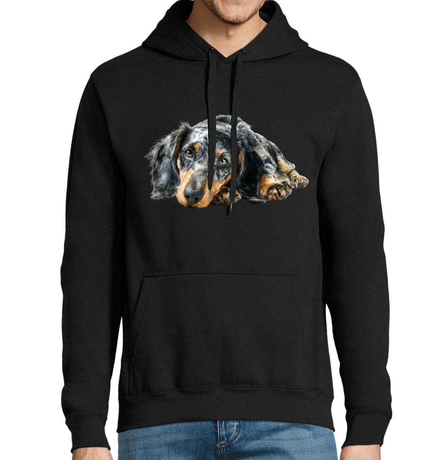 Pánská mikina Černý Jezevčík Krátkosrstý. Jezevčík leží v tichu, hlavu položenou, oči plné důvěry a klidu. Přesně ty chvíle, které každý pejskař zná – žádná akce, žádný hluk, jen přítomnost a pocit, že nejsi sám. Motiv působí jemně, hřejivě a opravdově. Ideální pro milovníky psů, klidných momentů a obrázků, které mají duši a umí zpomalit den.