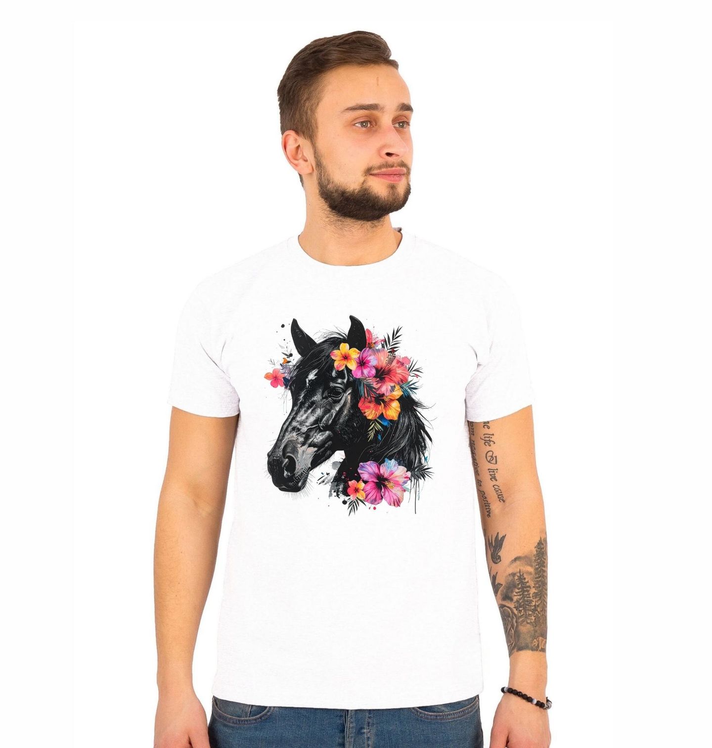Pánské tričko Černý Kůň s Tropickými Květinami. Stylový motiv spojuje krásu zvířete a jemnost přírody – dominantní kůň vyniká svou elegancí a sílou, zatímco barevné květiny dodávají designu svěží a moderní vzhled. Kontrast černé hlavy koně s výraznými tropickými barvami vytváří originální umělecký dojem, který upoutá na první pohled.