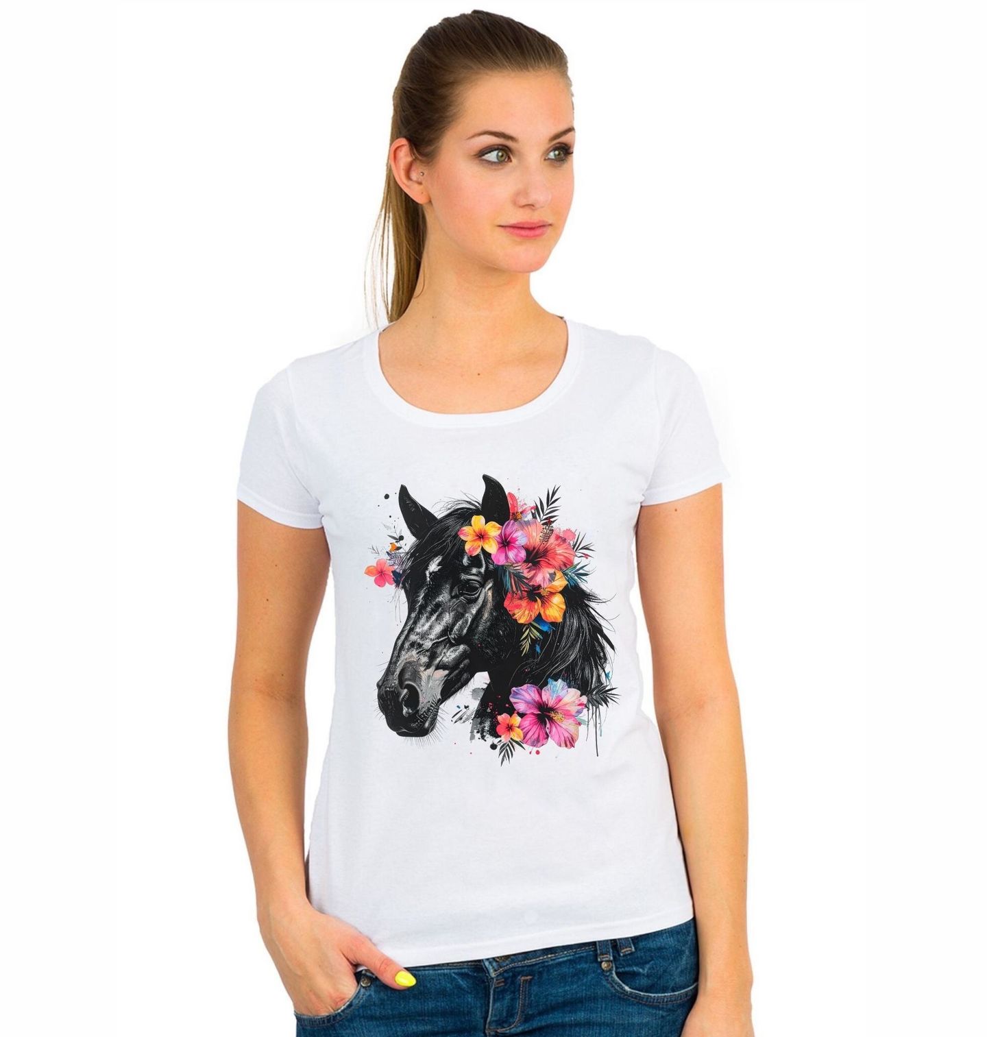 Dámské tričko Černý Kůň s Tropickými Květinami. Stylový motiv spojuje krásu zvířete a jemnost přírody – dominantní kůň vyniká svou elegancí a sílou, zatímco barevné květiny dodávají designu svěží a moderní vzhled. Kontrast černé hlavy koně s výraznými tropickými barvami vytváří originální umělecký dojem, který upoutá na první pohled.