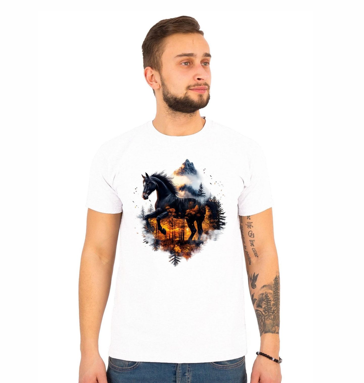 Pánské tričko Černý Kůň v Podzimním Lese. Silný a elegantní kůň vystupuje z mlhy jako symbol svobody a nespoutané přírody. V jeho siluetě se prolíná podzimní les zalitý zlatým světlem a v pozadí se tyčí majestátní hory, které dodávají celému motivu hloubku a dramatickou atmosféru. Kombinace tmavého koně, zářivých barev lesa a chladného horského vrcholu vytváří jedinečný umělecký efekt.