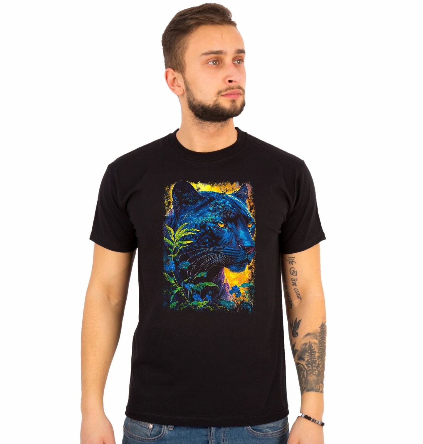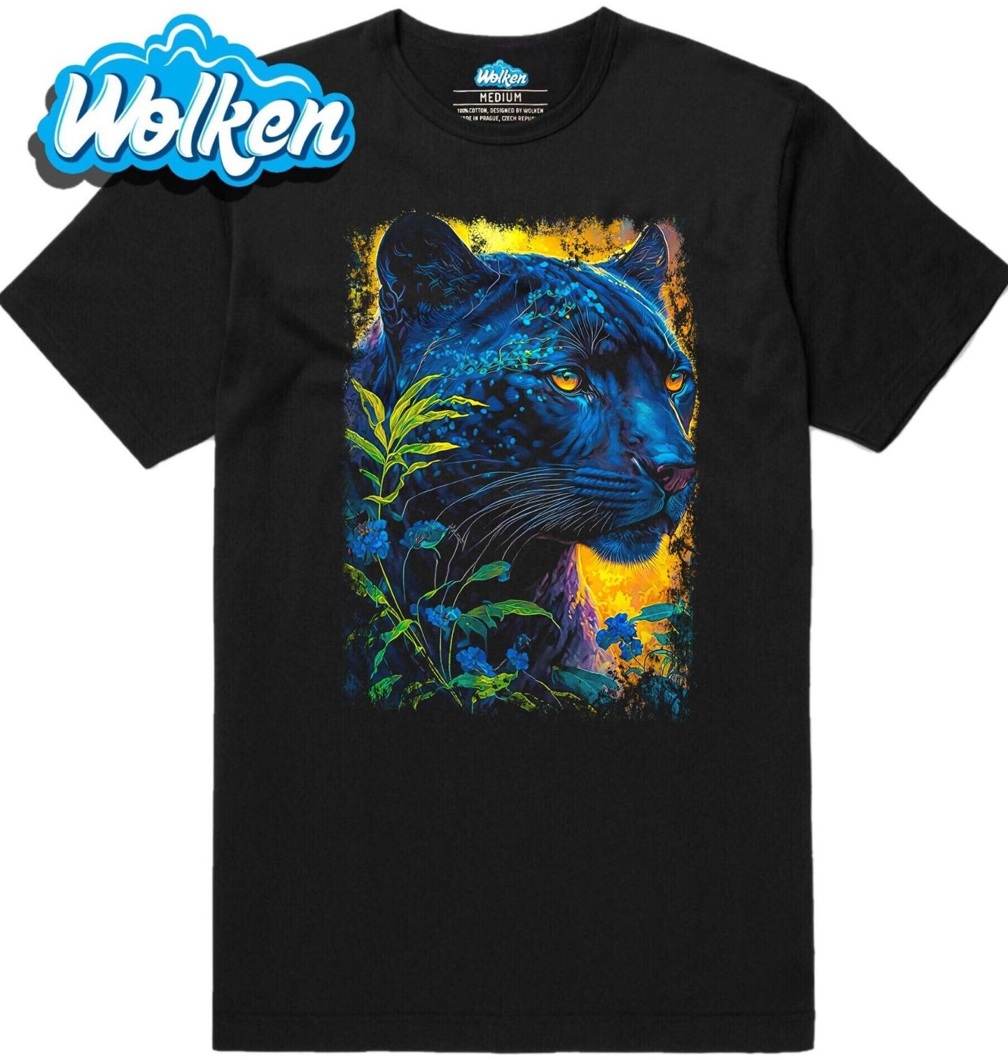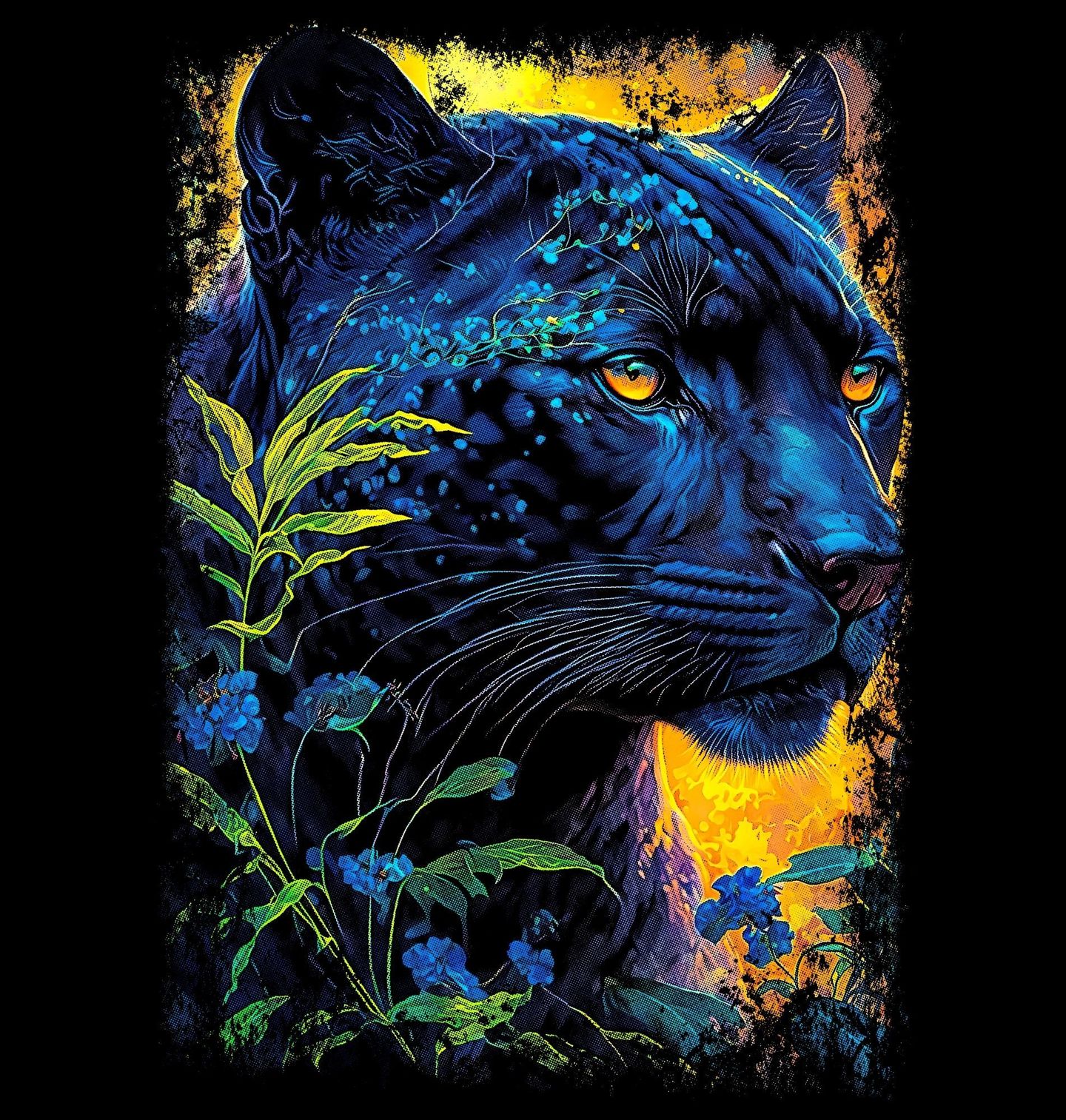 Pánské tričko Černý Panter v Džungli. Tajemná šelma ukrytá ve stínech džungle – silná, soustředěná a krásná. Tento výrazný motiv černého pantera s výraznýma zlatýma očima a květinovým rámem vás přenese do srdce divočiny. Šelma, která sleduje. Pro všechny milovníky přírody, síly, elegance a temné krásy.