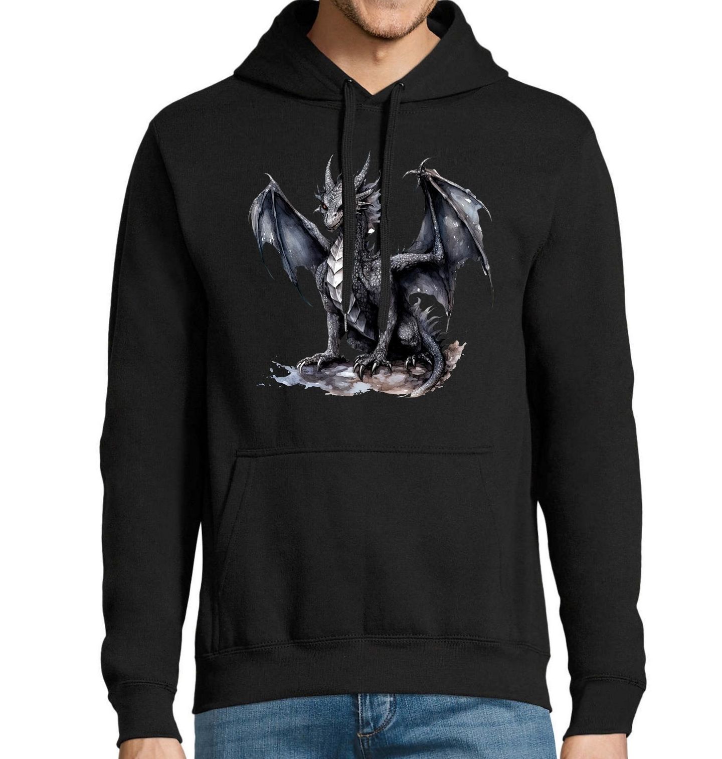 Pánská mikina Černý Stínový Drak. Mocný drak vystupuje ze stínů jako strážce dávných tajemství. Jeho rozepjatá křídla, ostré drápy a chladný pohled vyprávějí příběh o síle, odvaze a magii zapomenutých světů. Tento motiv dýchá temnou atmosférou a epickým napětím, které je typické pro žánr fantasy.Drak jako symbol síly a ochrany dodá motivu výrazný a nezaměnitelný charakter.