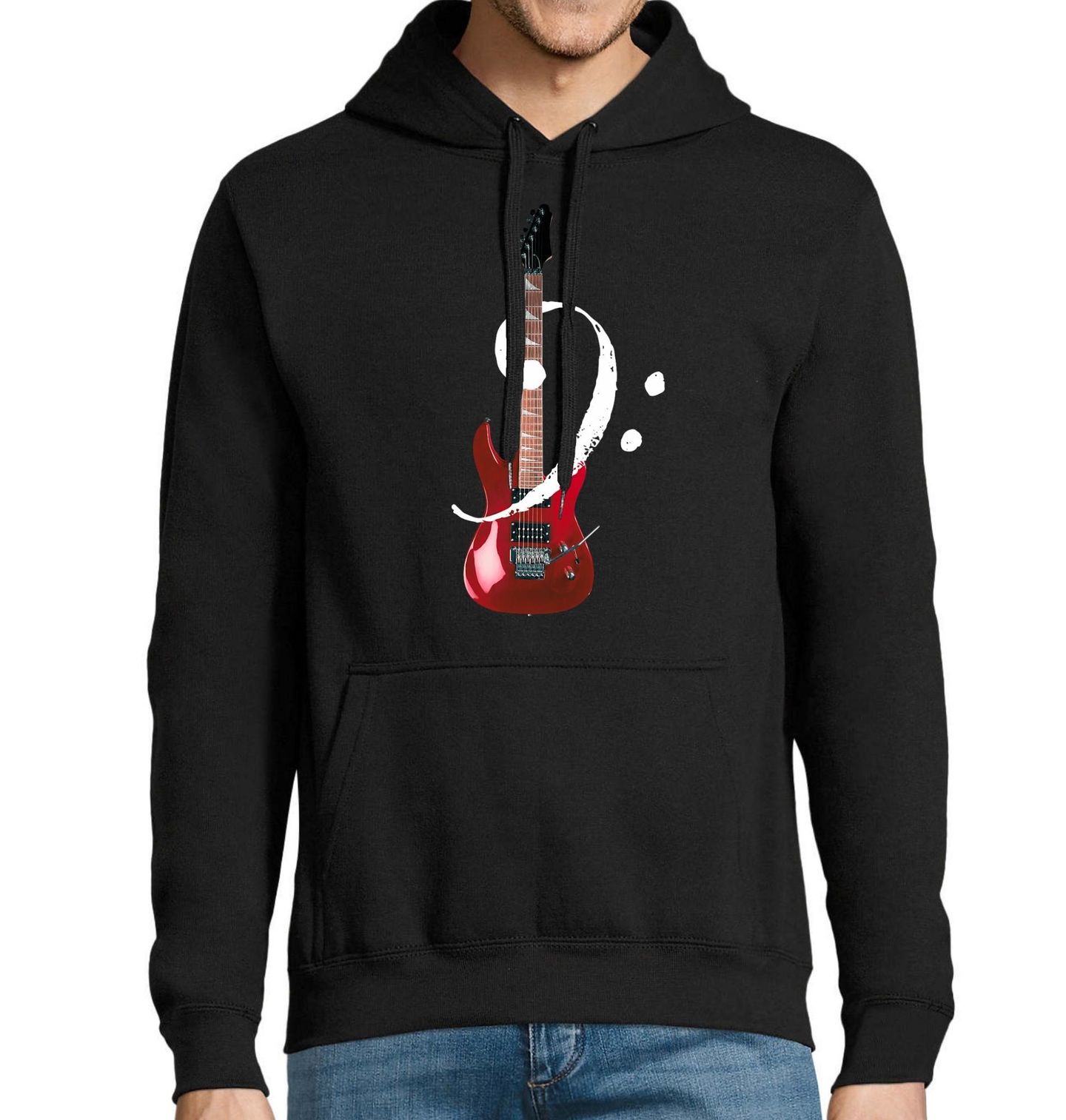Pánská mikina Červená Baskytara a Basový Klíč. Stylový hudební motiv spojuje silný symbol Basový Klíč s výrazným nástrojem, kterým je Baskytara v moderním červeném provedení. Design vyjadřuje hloubku tónu, rytmus a energii spodních frekvencí, které drží každou kapelu pohromadě. Dominantní Basový Klíč obepínající nástroj symbolizuje groove, stabilitu a sílu basové linky.