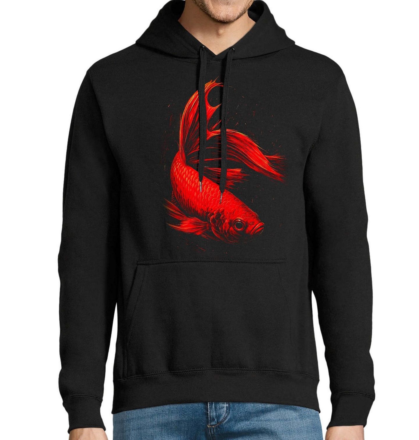 Pánská mikina Červená Bojovnice pestrá. Ohnivě červená ryba s dlouhými, vlajícími ploutvemi působí hrdě, nezkrotně a sebevědomě. Bojovnice pestrá je celosvětově jednou z nejoblíbenějších akvarijních ryb. Každý zkušený rybář v tomto motivu snadno rozpozná respekt k síle jednotlivce.
