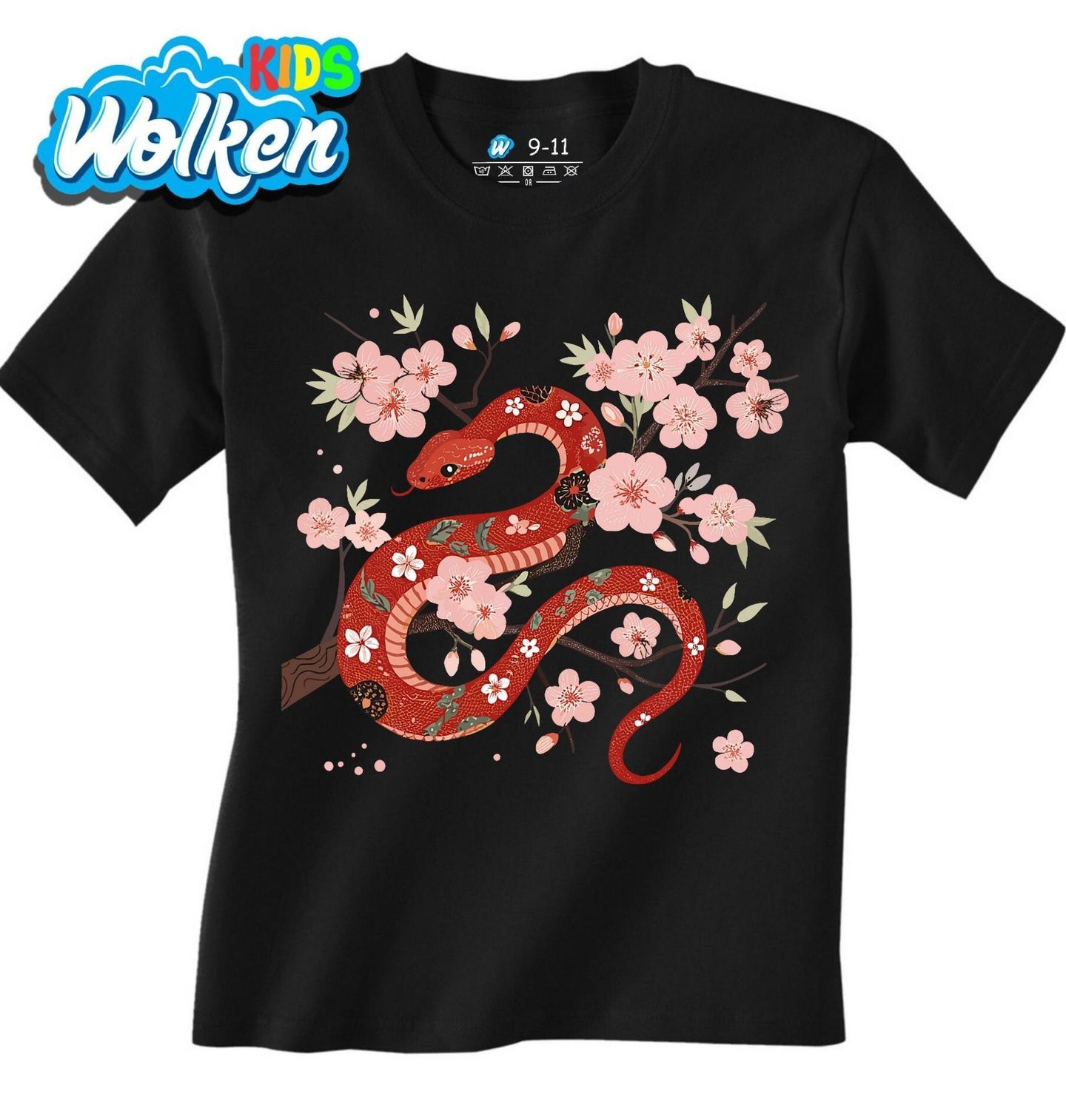 Dětské tričko Červený Had v Květech Sakury. Stylový motiv s výrazným plazem – červeným hadem v tradičním čínském stylu, obklopeným květy sakury. Tento design je inspirován symbolikou Roku hada, který je v Číně spojován s inteligencí, elegancí a hlubokým vnitřním poznáním. Perfektní volba pro milovníky hadů, plazů nebo pro ty, kdo slaví čínský lunární nový rok.