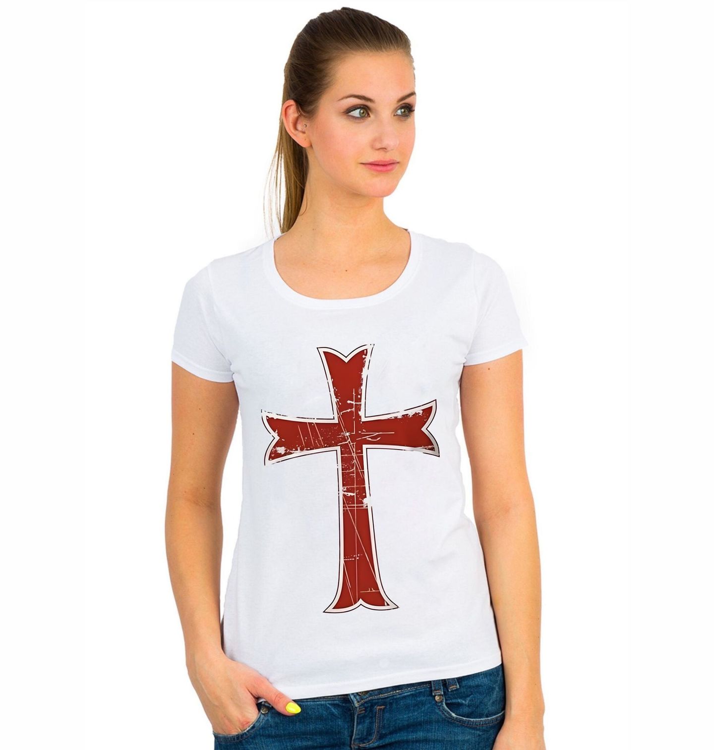 Dámské tričko Červený Kříž Templářů. Řád templářů neboli templářský řád, celým názvem Chudí rytíři Krista a Šalomounova chrámu, byl jeden z nejmocnějších křesťanských rytířských řádů středověku. Červený rovnoramenný kříž s rozšířenými konci a černo-bílý prapor byly obecnými znaky řádu.