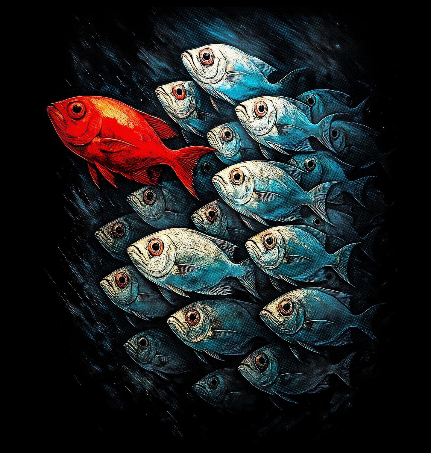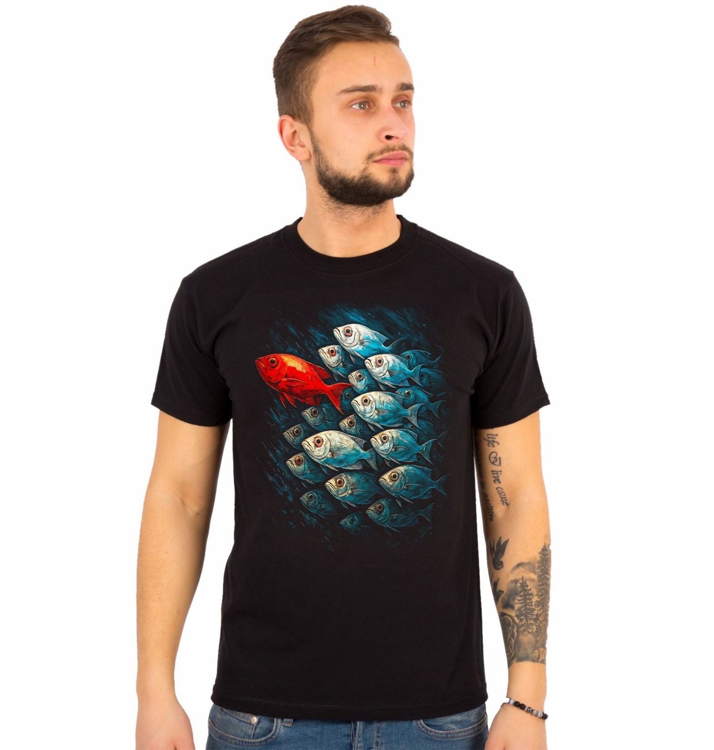 Pánské tričko Červený sleď mimo Hejno Red herring. Pojem Red herring vychází ze stylizovaného zobrazení sledě – konkrétně sleď atlantský – a označuje prvek, který odvádí pozornost od hlavního směru. V tomto uměleckém pojetí se červená ryba stává symbolem individuality, klamné stopy i vědomého rozhodnutí plavat jinam, než očekává okolí. Právě tuto filozofii dokáže každý zkušený rybář ocenit.