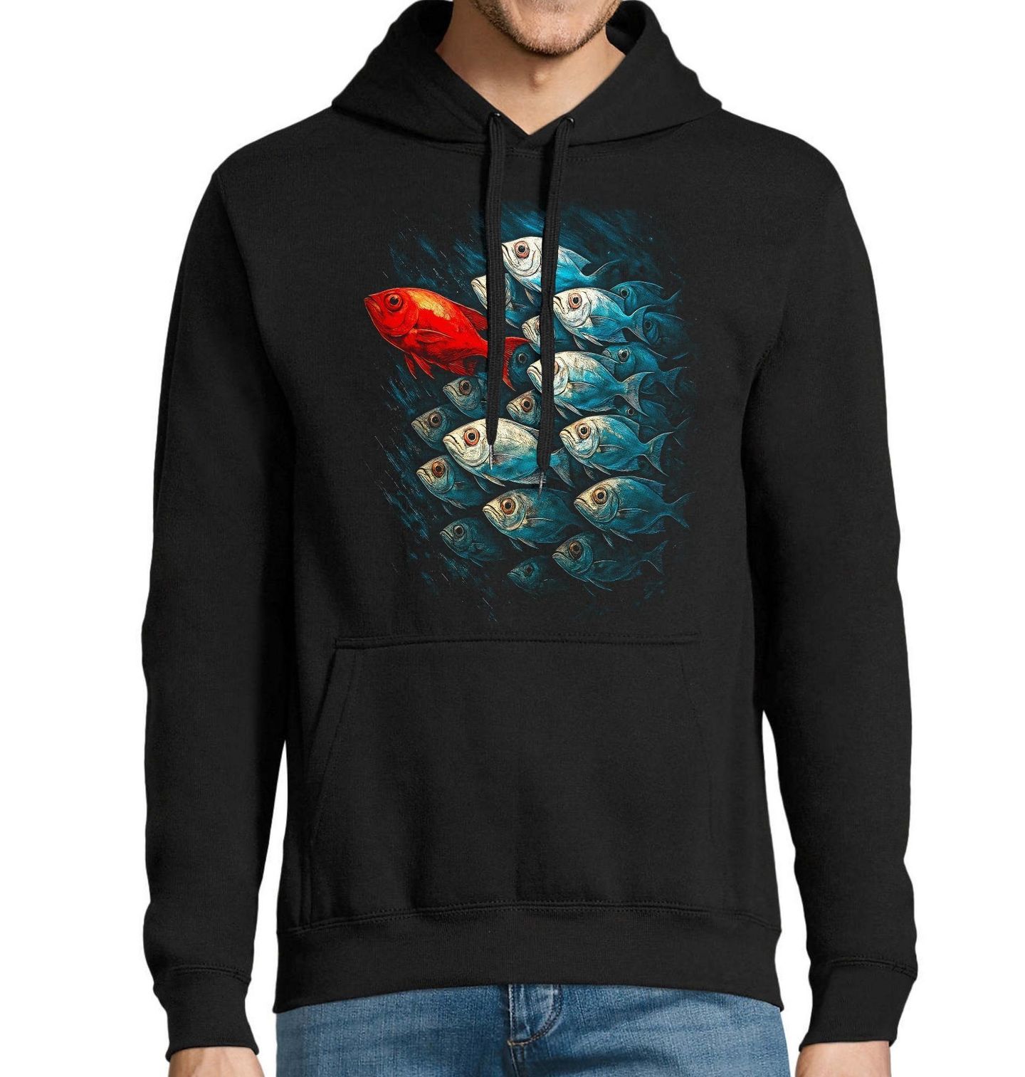 Pánská mikina Červený sleď mimo Hejno Red herring. Pojem Red herring vychází ze stylizovaného zobrazení sledě – konkrétně sleď atlantský – a označuje prvek, který odvádí pozornost od hlavního směru. V tomto uměleckém pojetí se červená ryba stává symbolem individuality, klamné stopy i vědomého rozhodnutí plavat jinam, než očekává okolí. Právě tuto filozofii dokáže každý zkušený rybář ocenit.