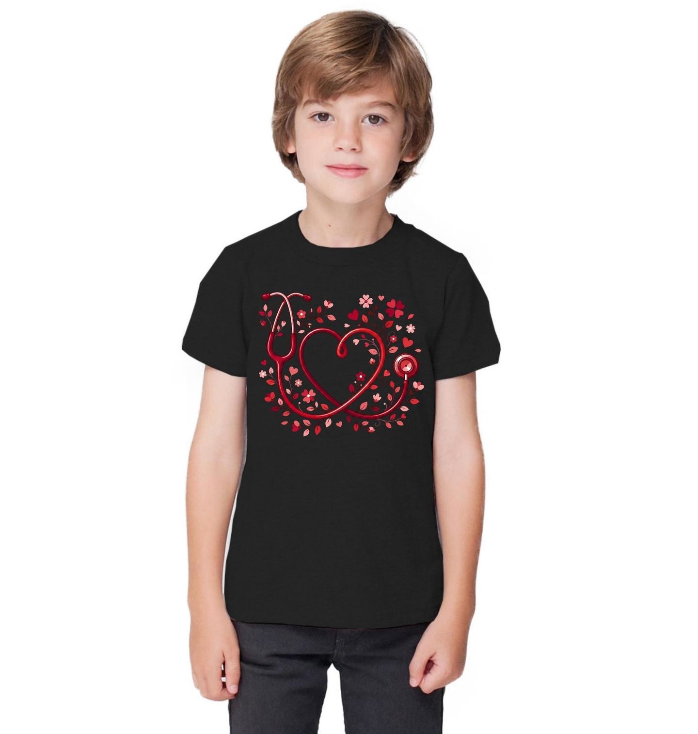 Dětské tričko Červený Stetoskop mezi Květy. Tento výrazný a emotivní motiv propojuje srdce a stetoskop do jednoho silného symbolu péče, empatie a oddanosti. Červený stetoskop tvarovaný do srdce doplněný jemnými květinovými a srdcovými detaily dokonale vystihuje poslání, které doktor a lékař každý den naplňují svou prací.