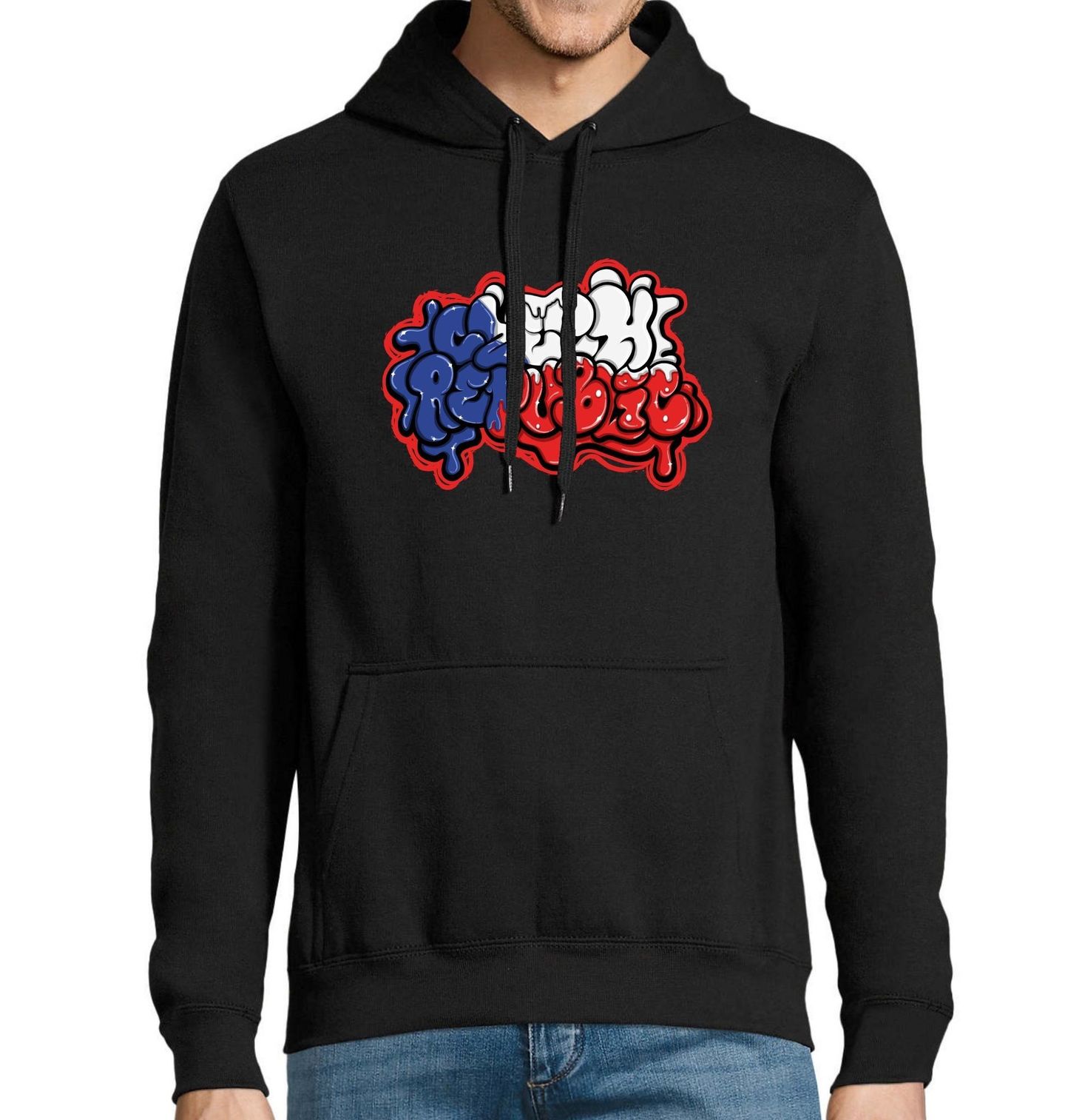 Pánská mikina Česko Czech Republic Graffiti Flag. Když máš Česko v srdci a street art v duši. Originální graffiti motiv v barvách české vlajky s "drip" efektem, který dává jasně najevo, odkud jsi – a že máš styl. Ideální pro milovníky urban kultury, originality a lokální hrdosti.
