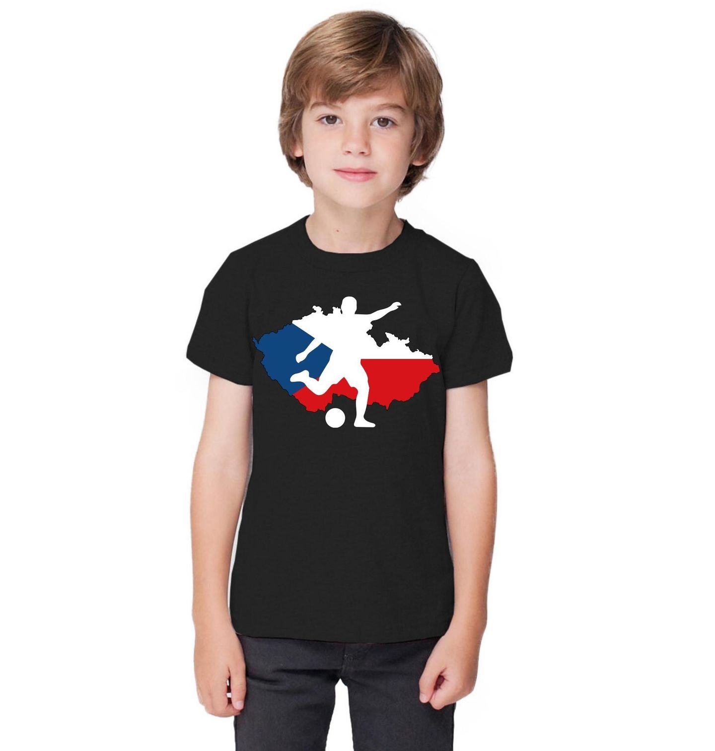 Dětské tričko Český Fotbalista. Stylový sportovní design spojuje vášeň pro fotbal a hrdost na Česko. Dynamická silueta hráče s míčem je zasazena do mapy státu v národních barvách, které symbolizují Česká republika a její bohatou sportovní tradici. Motiv je ideální pro fanoušky, hráče i všechny, kteří milují fotbal a chtějí ukázat podporu své zemi.