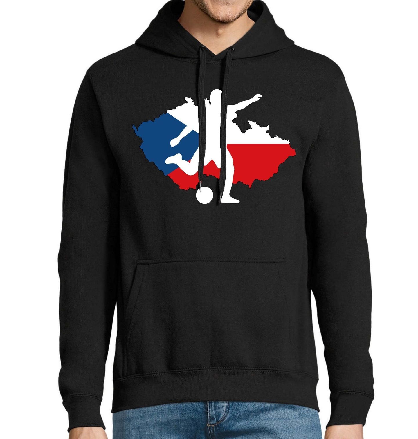 Pánská mikina Český Fotbalista. Stylový sportovní design spojuje vášeň pro fotbal a hrdost na Česko. Dynamická silueta hráče s míčem je zasazena do mapy státu v národních barvách, které symbolizují Česká republika a její bohatou sportovní tradici. Motiv je ideální pro fanoušky, hráče i všechny, kteří milují fotbal a chtějí ukázat podporu své zemi.