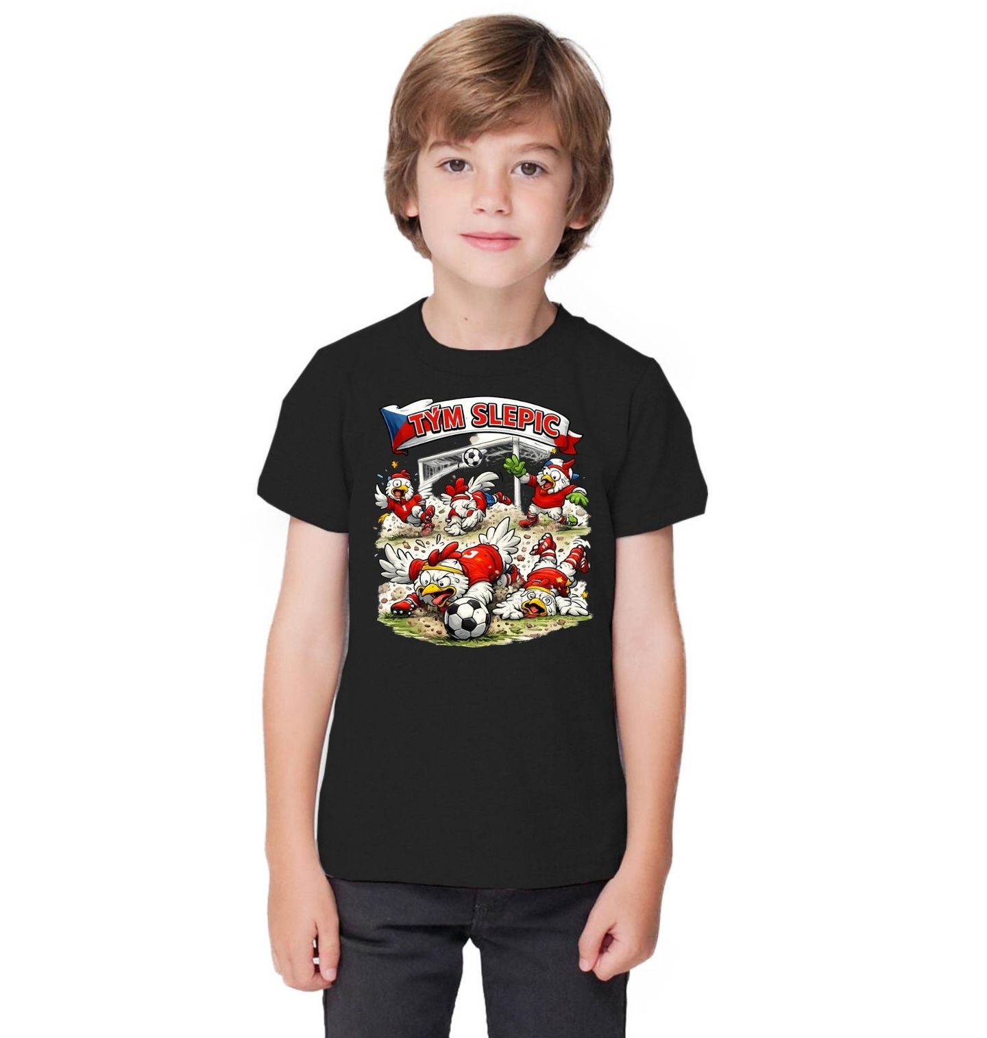 Dětské tričko Český Fotbalový Tým Slepic. Vtipné zpracování, kde slepice hrají fotbal, zaujme každého fanouška i milovníka zvířat. Tento design je ideální pro všechny, kteří milují fotbal a fandí srdcem – ať už na hřišti nebo u televize. Slepice, fotbal a Česko tvoří jedinečnou kombinaci, která zaručeně pobaví a odliší tě od ostatních. Skvělý tip na dárek pro fanoušky i hráče.