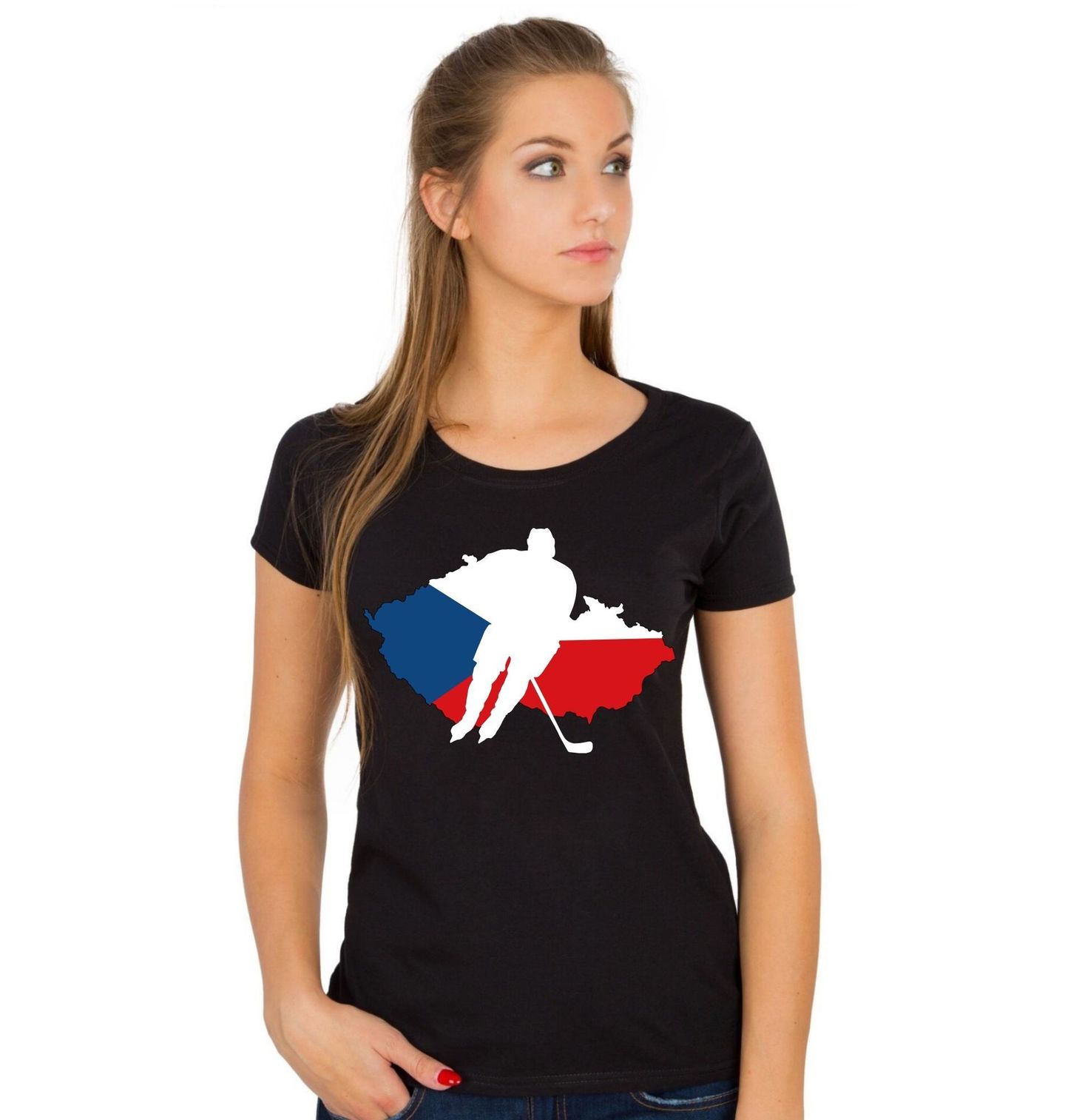 Dámské tričko Český Hokejista. Originální motiv spojuje sportovní vášeň a národní hrdost. Silueta hráče symbolizuje hokej, který patří mezi nejoblíbenější sporty, jaké Česko miluje. Pozadí tvoří mapa státu v barvách vlajky, což jasně odkazuje na Českou republiku a její úspěchy na ledě.