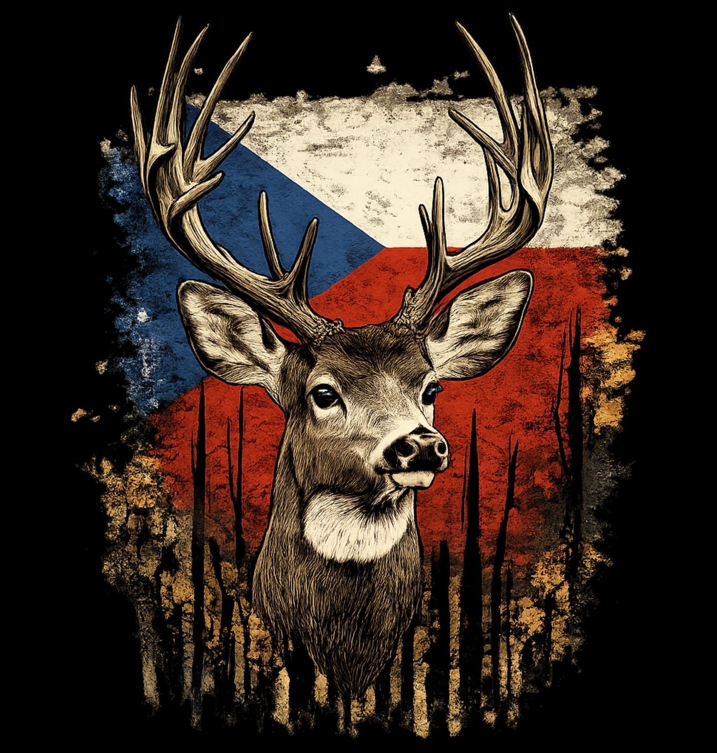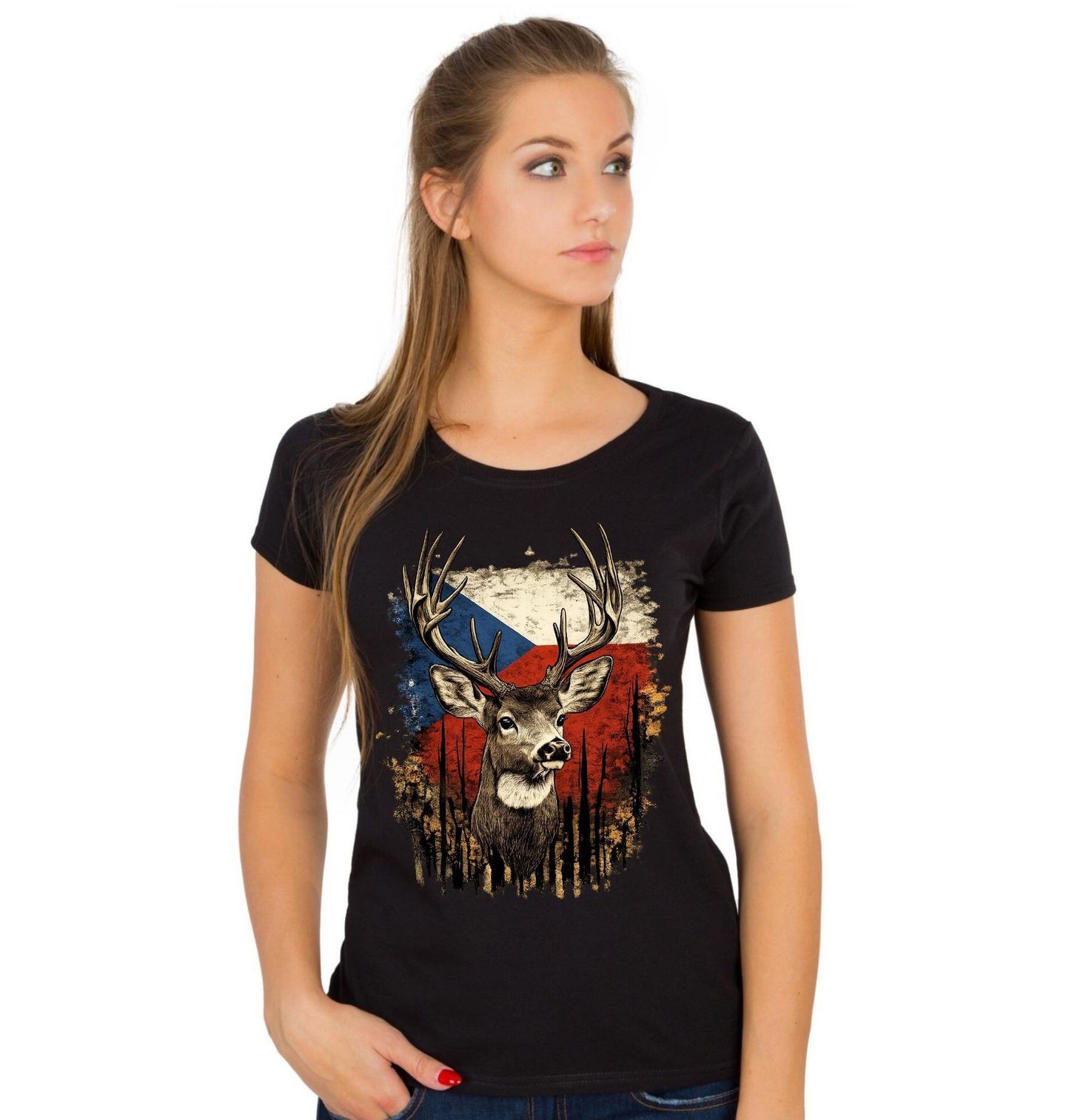 Dámské tričko Český Jelen lesní. Detailně zpracovaná silueta zvířete je zasazena do barev, které reprezentuje česko a jeho tradiční vlajka. Tento design osloví každého, komu je blízká příroda, lesní kultura a hodnoty, které ctí myslivec. Spojení divoké zvěře a národní identity dává motivu silný význam a jasně odkazuje na Česká republika.