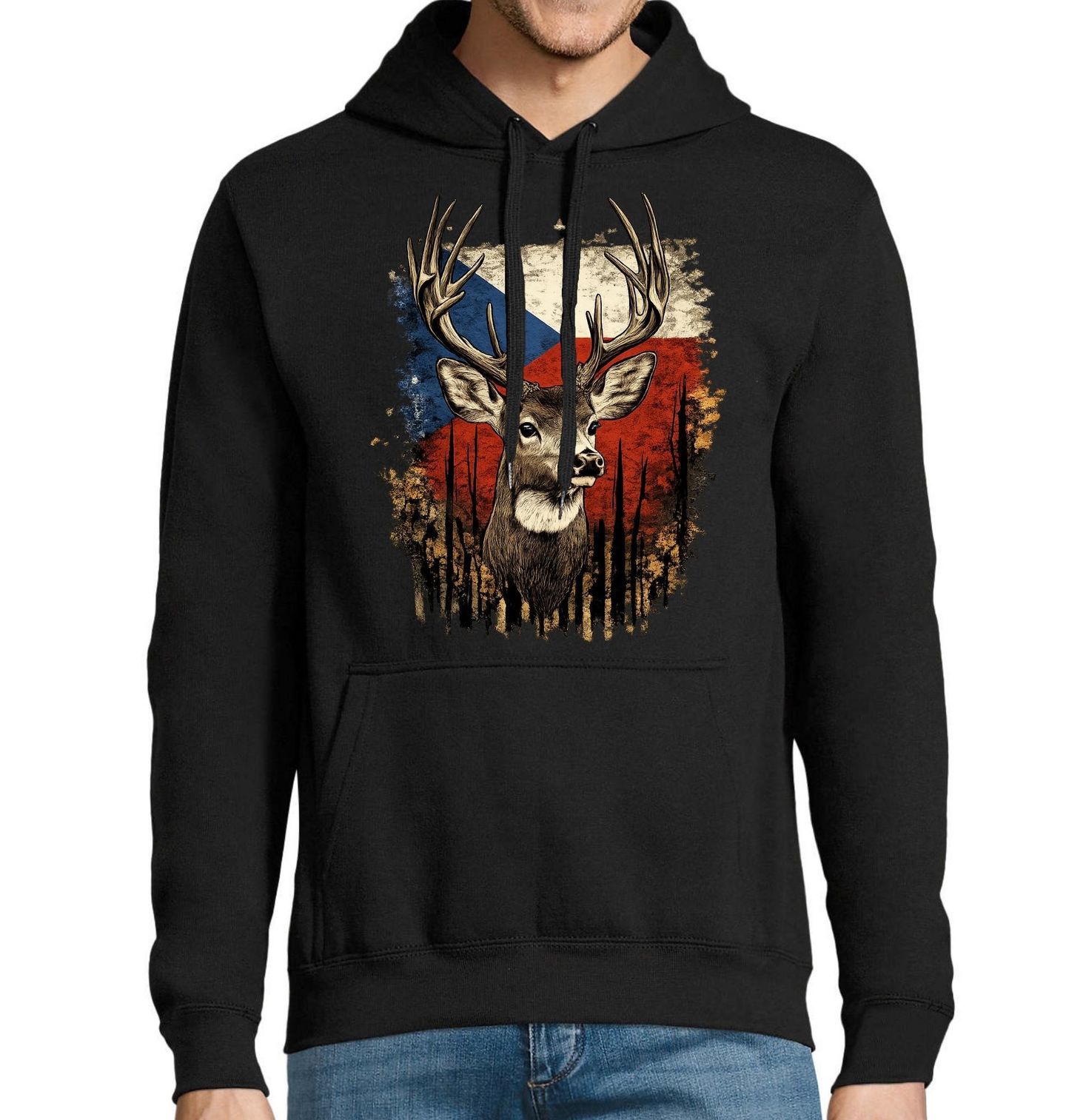 Pánská mikina Český Jelen lesní. Detailně zpracovaná silueta zvířete je zasazena do barev, které reprezentuje česko a jeho tradiční vlajka. Tento design osloví každého, komu je blízká příroda, lesní kultura a hodnoty, které ctí myslivec. Spojení divoké zvěře a národní identity dává motivu silný význam a jasně odkazuje na Česká republika.