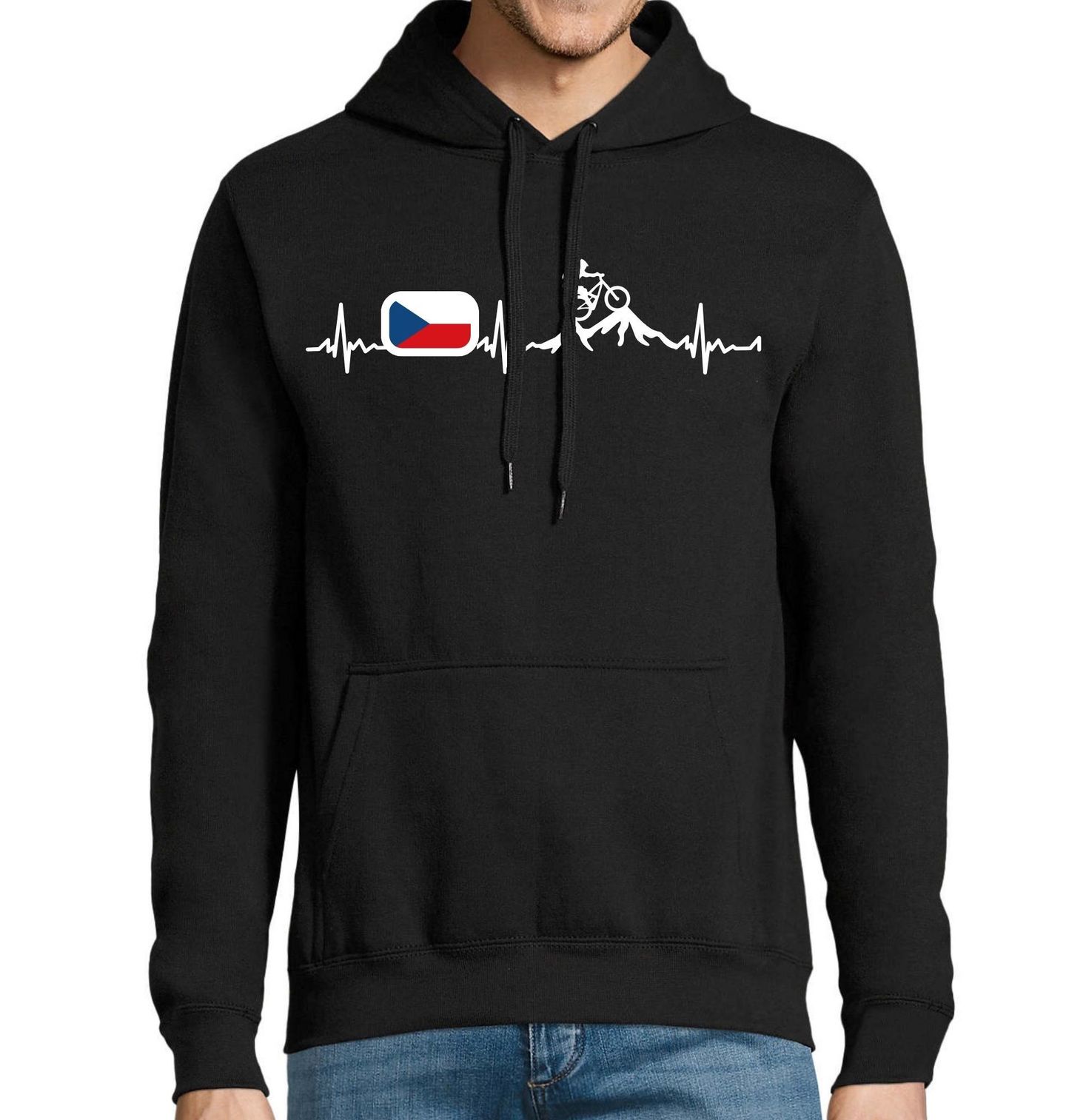 Pánská mikina Český Kardiogram a Cyklista na Horách. Originální motiv propojuje kardiogram s ikonickými prvky, které vystihují vášeň pro cyklistika, přírodu a domov jménem Česko. Celek doplňuje prvek, který připomíná Česko, a vytváří tak silné spojení mezi sportem, krajinou a identitou. Tento motiv je ideální pro všechny, kdo milují cyklistika, jízdu na kole v horách a jedinečnou atmosféru, kterou nabízí Česko.