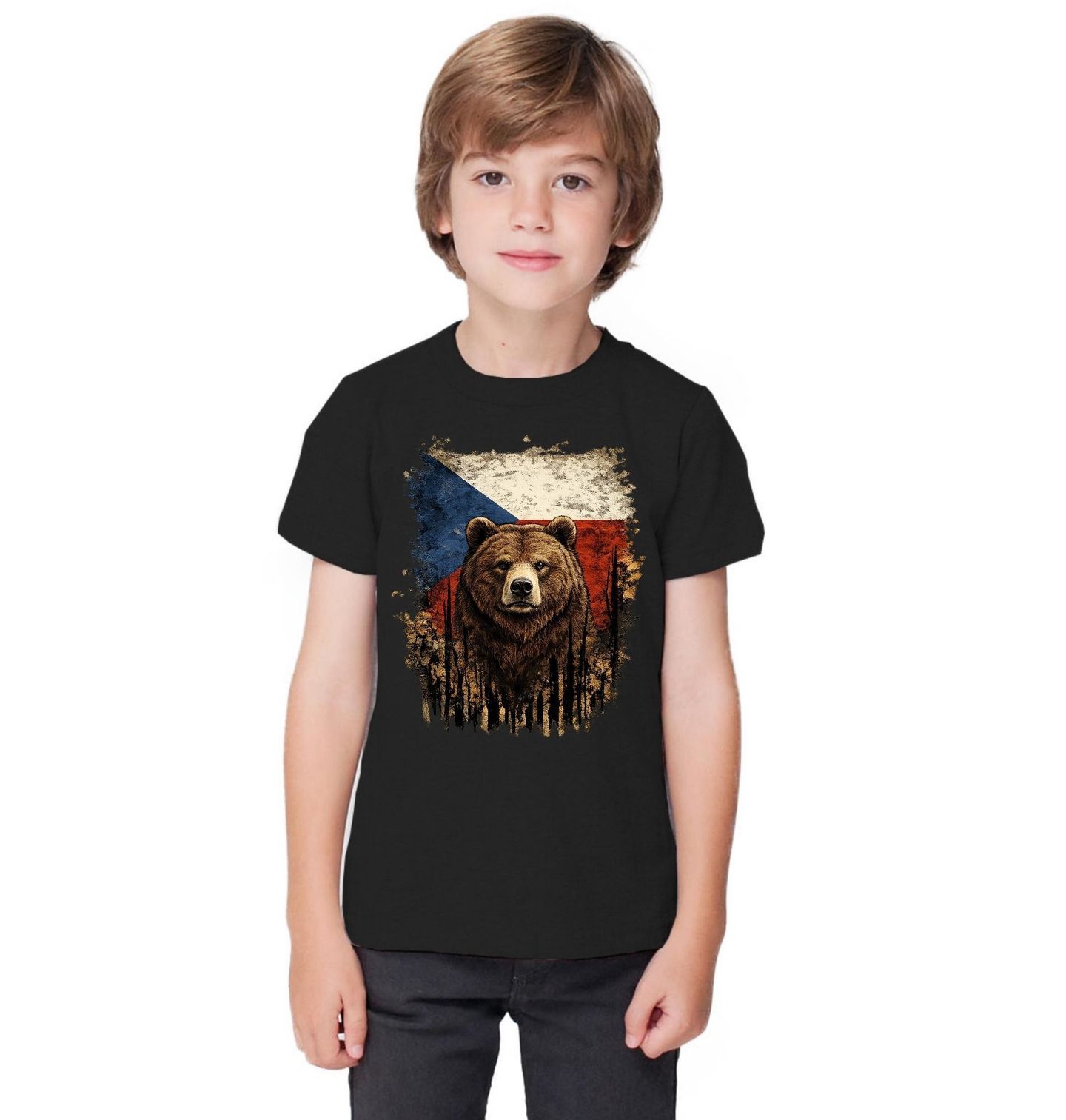 Dětské tričko Český Medvěd hnědý. Výrazný motiv, kde dominuje medvěd jako symbol síly, respektu a divoké přírody, doplněný o barvy, které jasně odkazují na česko. Design osloví každého, komu je blízká příroda, les a hodnoty, které ctí myslivec. Spojení zvířecí dominance a národní identity dělá z tohoto motivu ideální kousek pro milovníky lesa, outdooru i tradic, které reprezentuje česká republika.