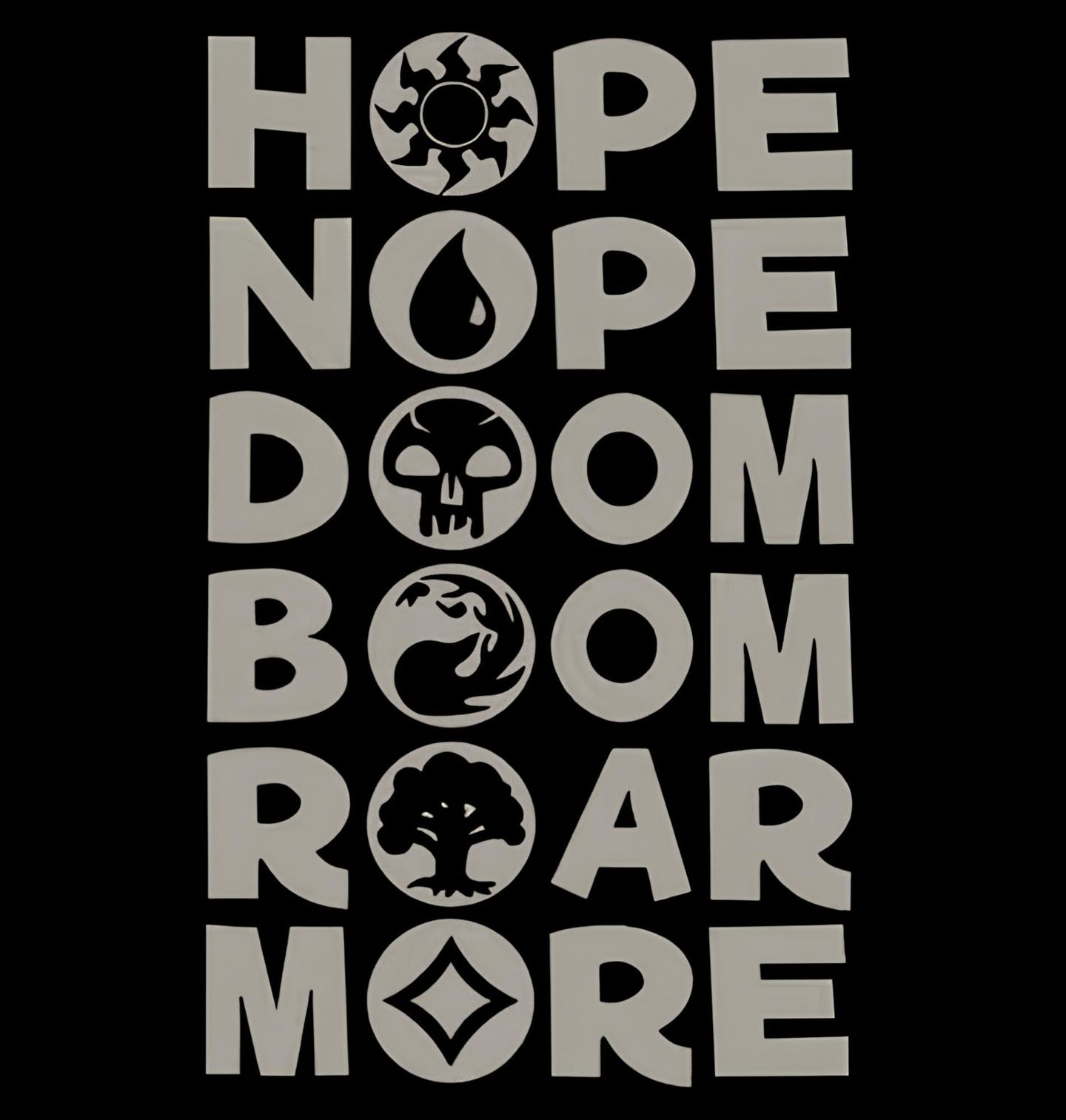 Pánské tričko Cesta Elementů Magic: The Gathering. Tento fascinující grafický list představuje vizuální poezii složenou z šesti klíčových slov a jejich odpovídajících symbolů. Každý řádek – od „HOPE“ se symbolem slunce a měsíce, přes nope, doom, boom, roar až po „MORE“ s ozubeným kolem a peřím – vypráví vlastní příběh. Je to minimalistické umělecké dílo, které nutí k zamyšlení nad silami, jež formují náš svět a naši lidskou zkušenost.
