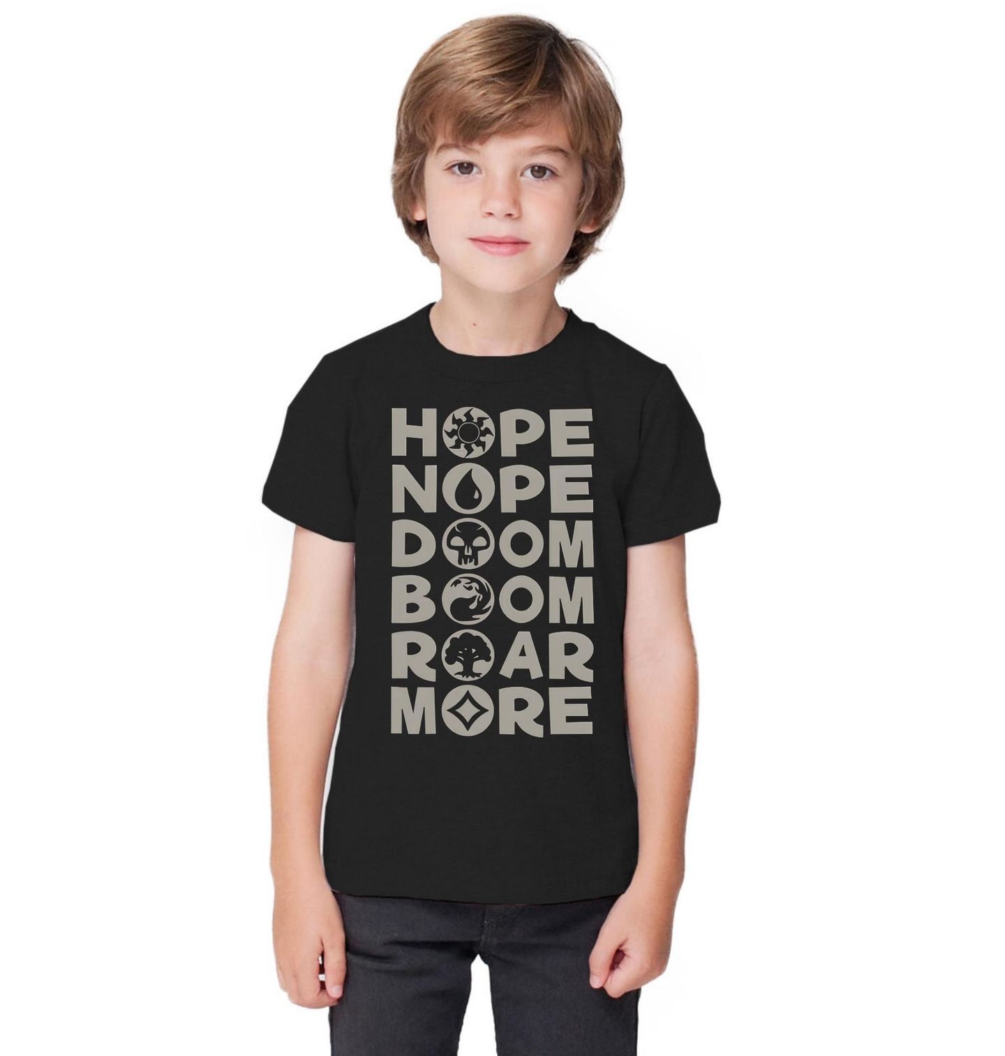 Dětské tričko Cesta Elementů Magic: The Gathering. Tento fascinující grafický list představuje vizuální poezii složenou z šesti klíčových slov a jejich odpovídajících symbolů. Každý řádek – od „HOPE“ se symbolem slunce a měsíce, přes nope, doom, boom, roar až po „MORE“ s ozubeným kolem a peřím – vypráví vlastní příběh. Je to minimalistické umělecké dílo, které nutí k zamyšlení nad silami, jež formují náš svět a naši lidskou zkušenost.