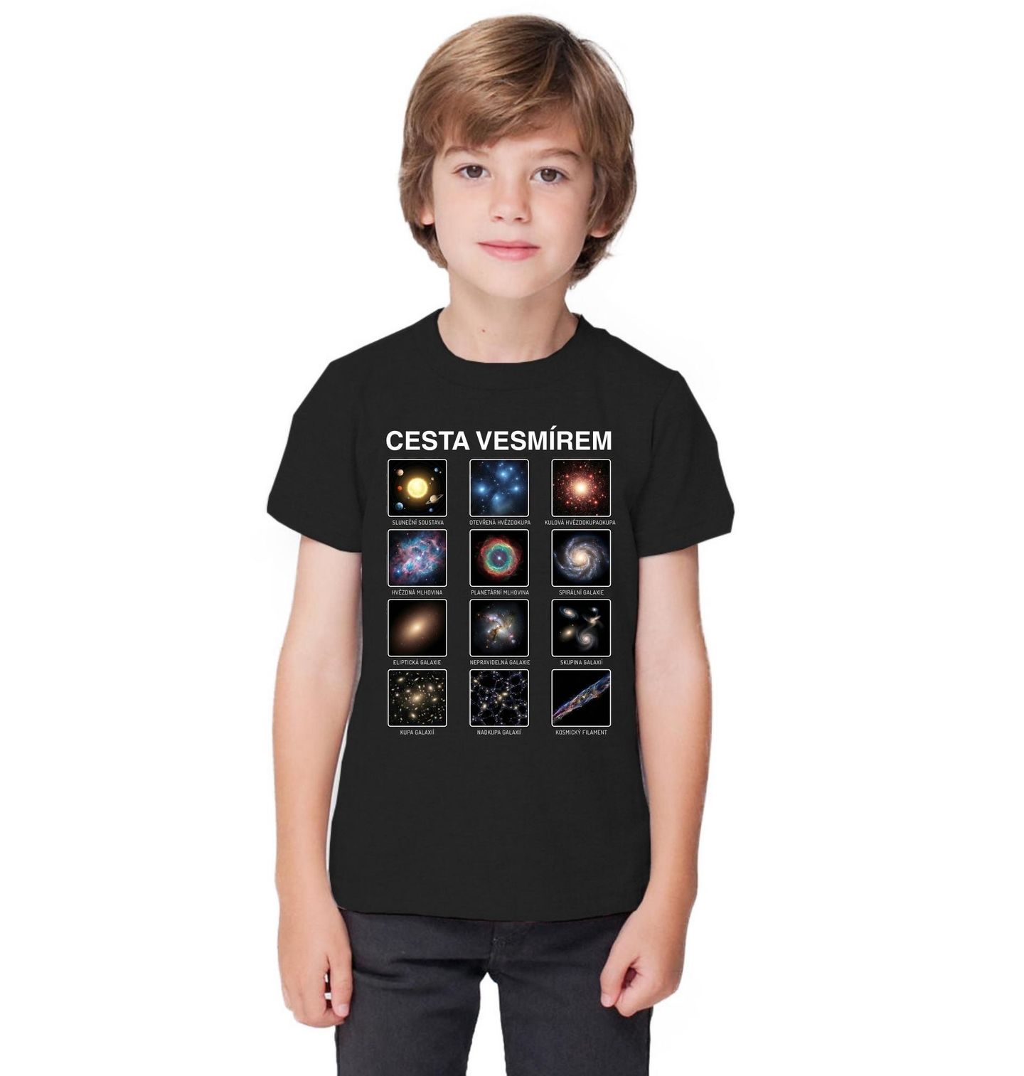 Dětské tričko Cesta Vesmírem. Perfektní dárek pro milovníky vesmíru, astronomie a nekonečných dálav. Na motivu najdeš jednotlivé části vesmíru přehledně: Sluneční soustava, Otevřená hvězdokupa, Kulová hvězdokupa, Hvězdná mlhovina, Planetární mlhovina, Spirální galaxie, Eliptická galaxie, Nepravidelná galaxie, Skupina galaxií, Kupa galaxií, Nadkupa galaxií, Kosmický filament.