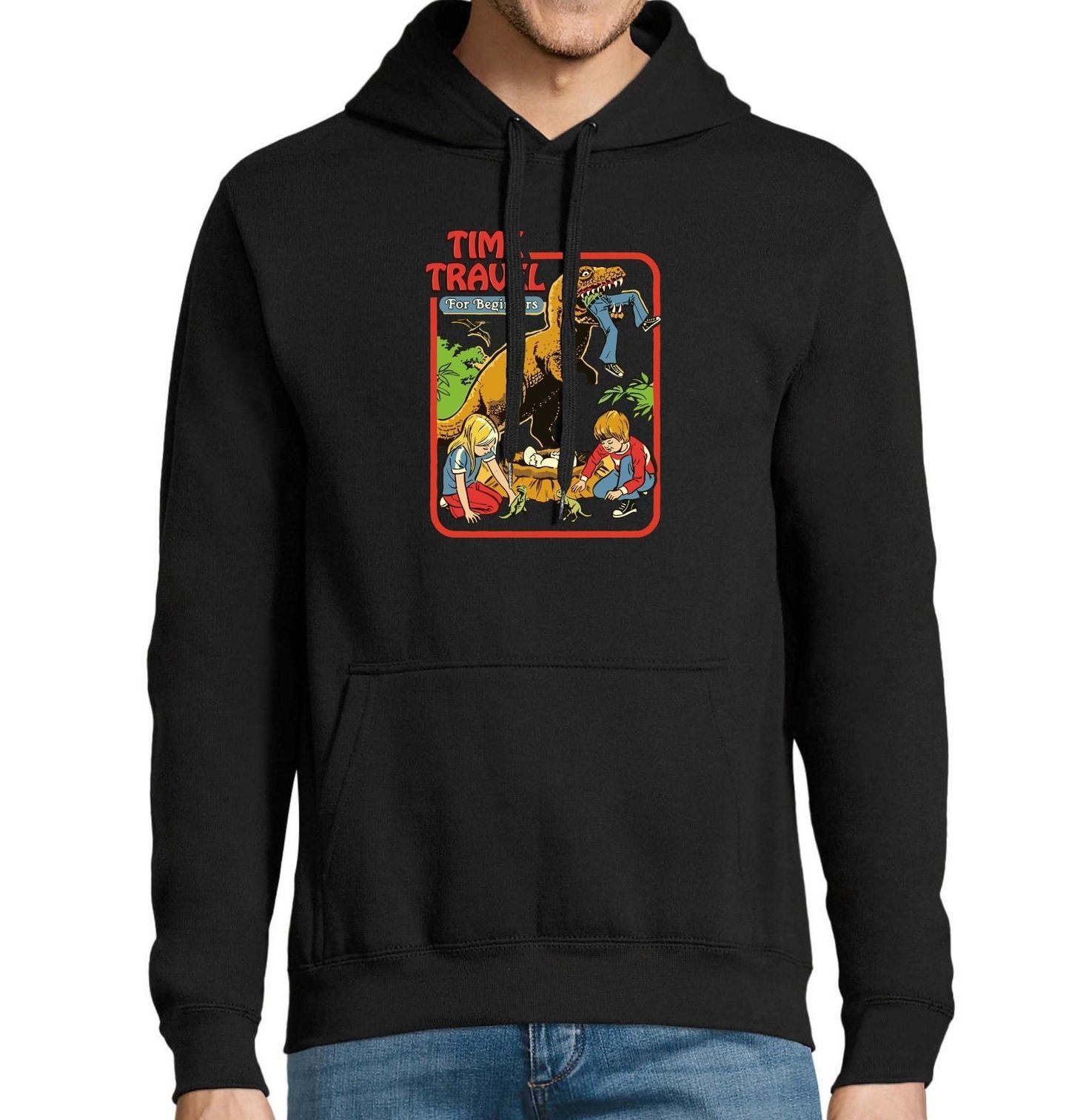 Pánská mikina Cestování časem Steven Rhodes Time Travel. Time Travel for Beginners. Uprostřed prehistorické džungle si děti hrají s mláďaty, zatímco v pozadí dinosaurus právě konzumuje jejich kamaráda. Ilustrace je zpracována ve stylu Steven Rhodes – umělce, který proslul svými parodickými kresbami inspirovanými retro dětskými učebnicemi a hororovým humorem.