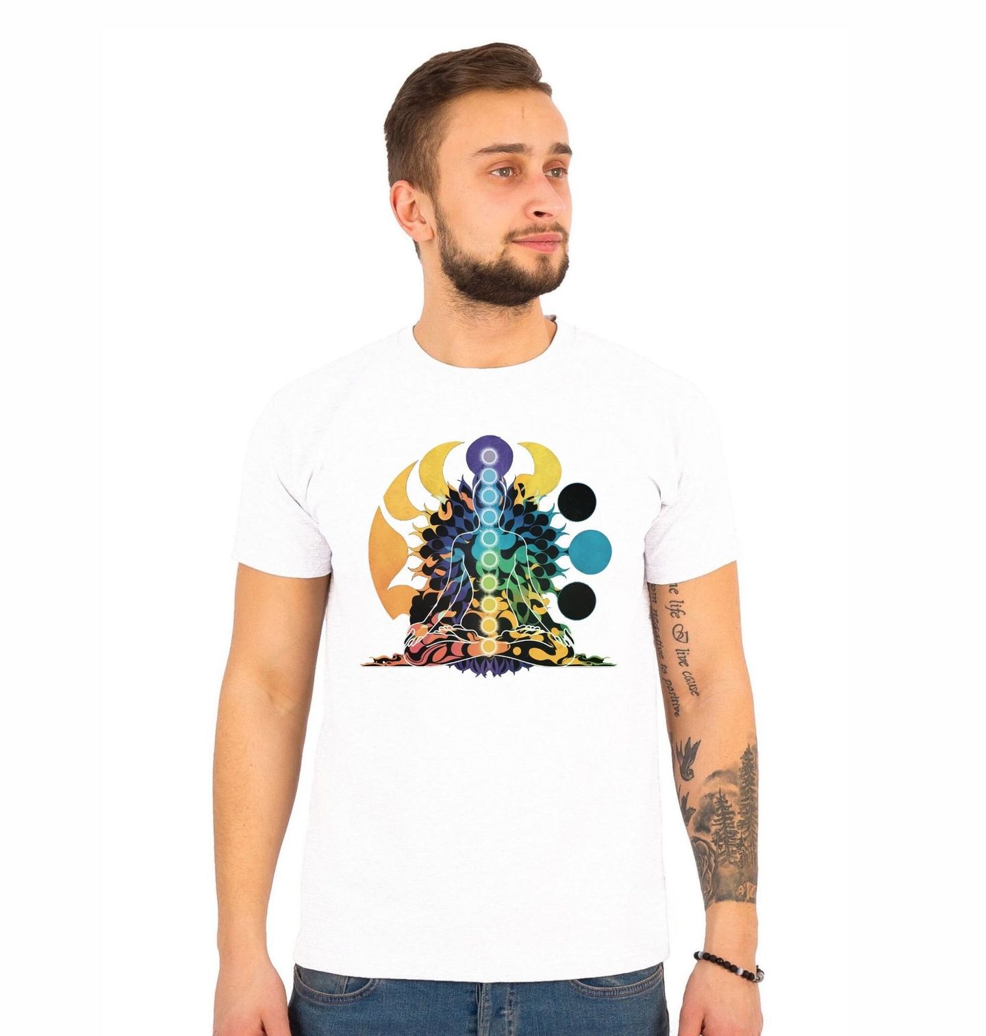 Pánské tričko Chakra Meditace. Barevný motiv meditující postavy se zvýrazněnými čakrami podél těla. Každá čakra je zobrazena jako zářící barevný bod, doplněný abstraktními tvary a kosmickými prvky. Symbolizuje energii, rovnováhu a spiritualitu.