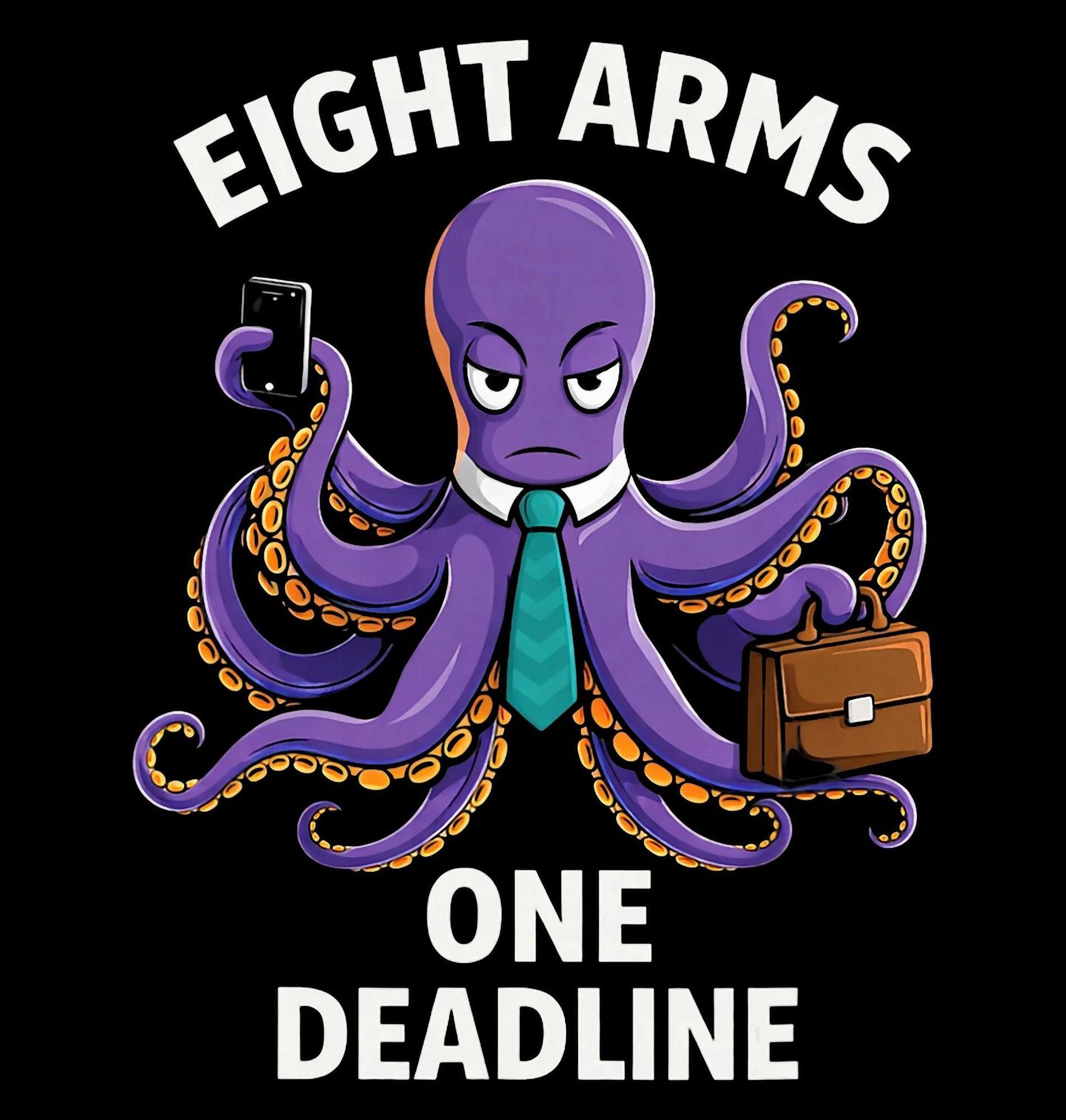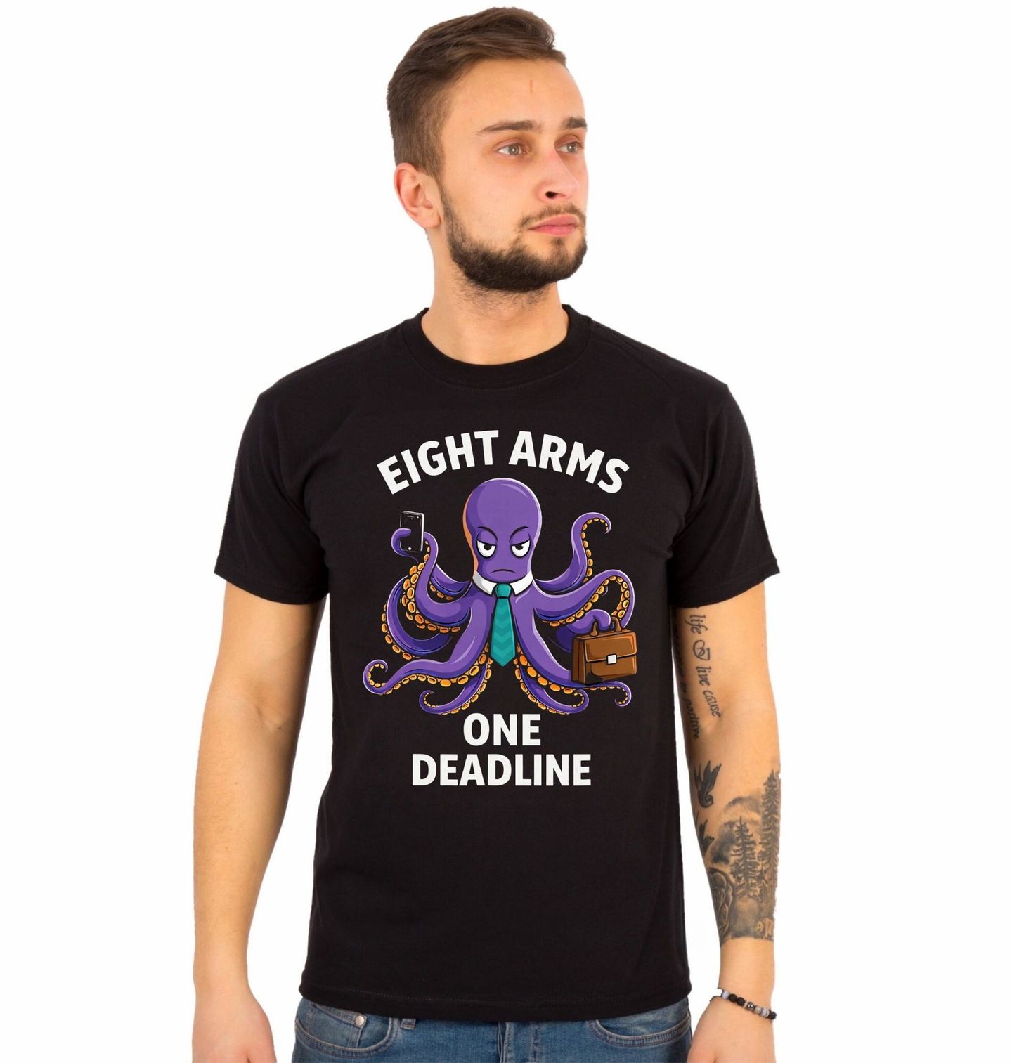 Pánské tričko Chapadla Plné Práce. Vtipný motiv, kde chobotnice v elegantním stylu zvládá multitasking. Její chapadla drží telefon i kufr a doplňuje ji stylová kravata. Design vystihuje pracovní shon i humor každodenních povinností. Text na obrázku „EIGHT ARMS ONE DEADLINE“ znamená „Osm chapadel, jeden termín“.